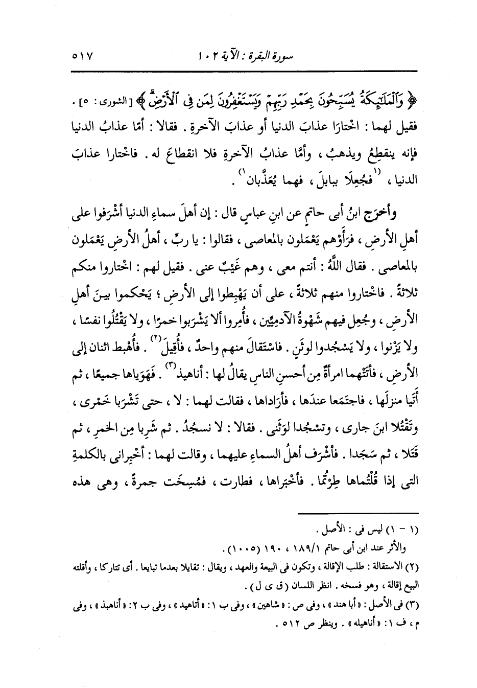 وأخرج ابن جرير من طريق أبي عثمان النهدي عن ابن مسعود ، وَابن عباس قالا : لما كثر بنو آدم وعصوا دعت الملائكة عليهم والأرض والجبال : ربنا لا تمهلهم ، فأوحى الله إلى الملائكة : أني أزلت الشهوة والشيطان من قلوبكم ولو تركتكم لفعلتم أيضا ، قال : فحدثوا أنفسهم أن لو ابتلوا لعصموا فأوحى اله إليهم : أن اختاروا ملكين من أفضلكم ، فاختاروا هاروت وماروت فأهبطا إلى الأرض وأنزلت الزهرة إليهما في صورة امرأة من أهل فارس يمونها بيدخت ، قال : فواقعاها بالخطيئة فكانت الملائكة يستغفرون للذين آمنوا فلما وقعا بالخطيئة استغفروا لمن في الأرض فخيرا بين عذاب الدنيا وعذاب الآخرة فاختارا عذاب الدنيا.