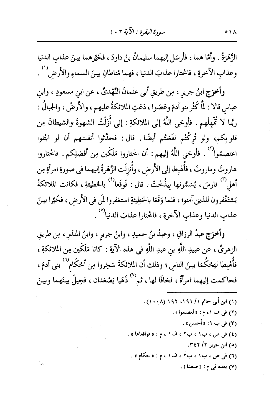 وأخرج سعيد بن منصور عن خصيف قال : كنت مع مجاهد فمر بنا رجل من قريش فقال له مجاهد : حدثنا ما سمعت من أبيك قال : حدثني أبي : أن الملائكة حين جعلوا ينظرون إلى أعمال بني آدم وما يركبون من المعاصي الخبيثة وليس يستر الناس من الملائكة شيء فجعل بعضهم يقول لبعض : انظروا إلى بني آدم كيف يعملون كذا وكذا ما أجرأهم على الله يعيبونهم بذلك فقال الله لهم : لقد سمعت الذي تقولون في بني آدم فاختاروا منكم ملكين أهبطهما إلى الأرض وأجعل فيهما شهوة بني آدم فاختاروا هاروت وماروت فقالوا : يا رب ليس فينا مثلهما ، فأهبطا إلى الأرض وجعلت فيهما شهوة بني آدم ومثلت لهما الزهرة في صورة امرأة فلما نظرا إليها لم يتمالكا أن تناولا ما الله أعلم به وأخذت الشهوة بأسماعهما وأبصارهما فلما أرادا أن يطيرا إلى السماء لم يستطيعا فأتاهما ملك فقال : إنكما قد فعلتما ما فعلتما فاختاراعذاب الدنيا أو عذاب الآخرة ، فقال أحدهما للآخر : ماذا ترى قال : أرى أن أعذب في الدنيا ثم أعذب أحب إلي من أن أعذب ساعة واحدة في الآخرة فهما معلقان منكسان في السلاسل وجعلا فتنة.