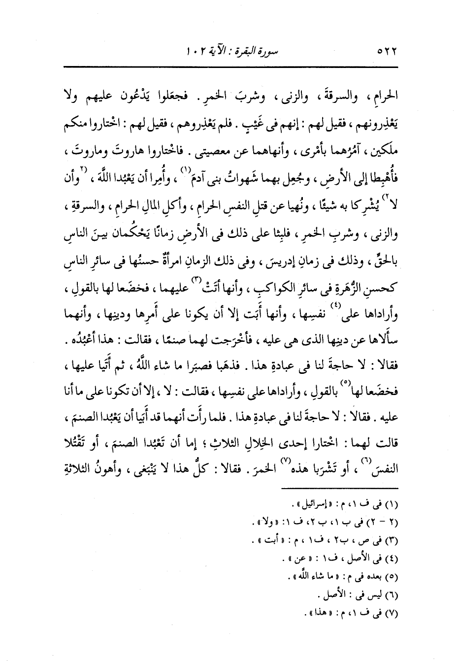 شرب الخمر ، وسقتهما الخمر حتى إذا أخذت الخمرة فيهما وقعا بها فمر إنسان وهما في ذلك فخشيا أن يفشي عليهما فقتلاه ، فلما أن ذهب عنهما السكر عرفا ما قد وقعا فيه من الخطيئه وأرادا أن يصعدا إلى السماء فلم يستطيعا وكشف الغطاء فيما بينهما وبين أهل السماء فنظرت الملائكة إلى ما قد وقعا فيه من الذنوب وعرفوا أنه من كان في غيب فهو أقل خشية فجعلوا بعد ذلك يستغفرون لمن في الأرض فلما وقعا فيما وقعا فيه من الخطيئة قيل لهما : اختارا عذاب الدنيا أو عذاب اللآخرة فقالا : أما عذاب الدنيا فينقطع ويذهب وأما عذاب الآخرة فلا انقطاع له فاختارا عذاب الآخرة فجعلا ببابل فهما يعذبان.