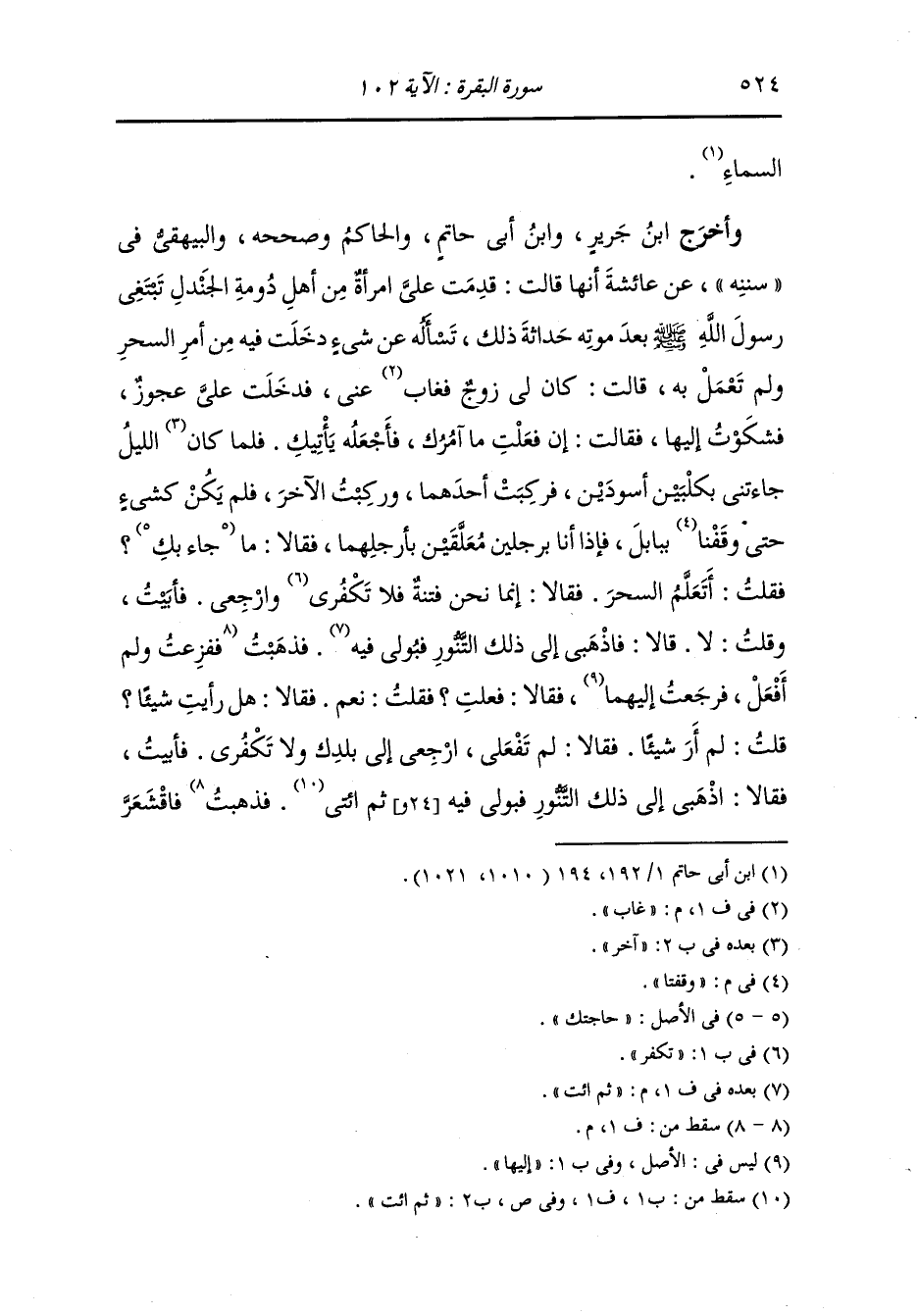 جلدي وخفت ثم رجعت إليهما فقلت : قد فعلت ، فقالا : ما رأيت فقلت : لم أر شيئا ، فقالا : كذبت لم تفعلي ارجعي إلى بلادك ولا تكفري فإنك على رأس أمرك فأبيت ، فقالا اذهبي إلى ذلك التنور فبولي به وذهبت فبلت فيه فرأيت فارسا مقنعا بحديد خرج مني حتى ذهب في السماء وغاب عني حتى ما أراه وجئتهما فقلت : قد فعلت ، فقالا : فما رأيت فقلت : رأيت فارسا مقنعا خرج مني فذهب في السماء حتى ما أراه ، قالا : صدقت ذلك إيمانك خرج منك اذهبي ، فقلت للمرأة : والله ما أعلم شيئا ولا قالا لي شيئا ، فقالت : لا لم تريدي شيئا إلا كان خذي هذا القمح فابذري فبذرت وقلت اطلعي فاطلعت قلت احقلي فاحقلت ثم قلت افركي فأفركت ثم قلت ايبسي فأيبست ثم قلت اطحني فأطحنت ثم قلت اخبزي فأخبزت فلما رأيت أني لا أريد شيئا إلا كان سقط في يدي وندمت والله يا أم المؤمنين ما فعلت شيئا ولا أفعله أبدا فسألت رسول أصحاب الله صلى الله عليه وسلم وهم يومئذ متوافرون فما دروا ما يقولون لها وكلهم خاف أن يفتيها بما لا يعلمه إلا أنه قد قال لها ابن عباس أو بعض من كان عنده لو كان أبواك حيين أو أحدهما لكانا يكفيانك