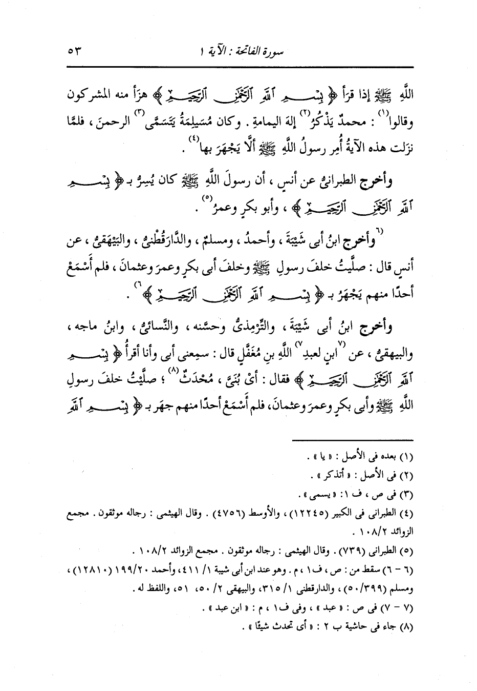 وأخرج ابن أبي شيبة والترمذي وحسنه والنسائي ، وَابن ماجه والبيهقي عن ابن عبد الله بن مغفل قال : سمعني أبي وأنا أقرأ {بسم الله الرحمن الرحيم} فقال : أي بني محدث صليت خلف رسول الله صلى الله عليه وسلم وأبو بكر وعمر وعثمان فلم أسمع أحدا منهم جهر {بسم الله