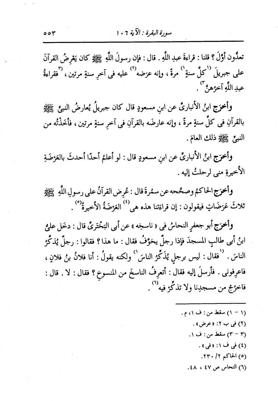 وأخرج ابو داود والنحاس كلاهما في الناسخ والمنسوخ والبيهقي في "سُنَنِه" عن أبي عبد الرحمن السلمي قال : مر علي بن أبي طالب برجل يقص فقال : أعرفت الناسخ والمنسوخ قال : لا ، قال : هلكت وأهلكت.