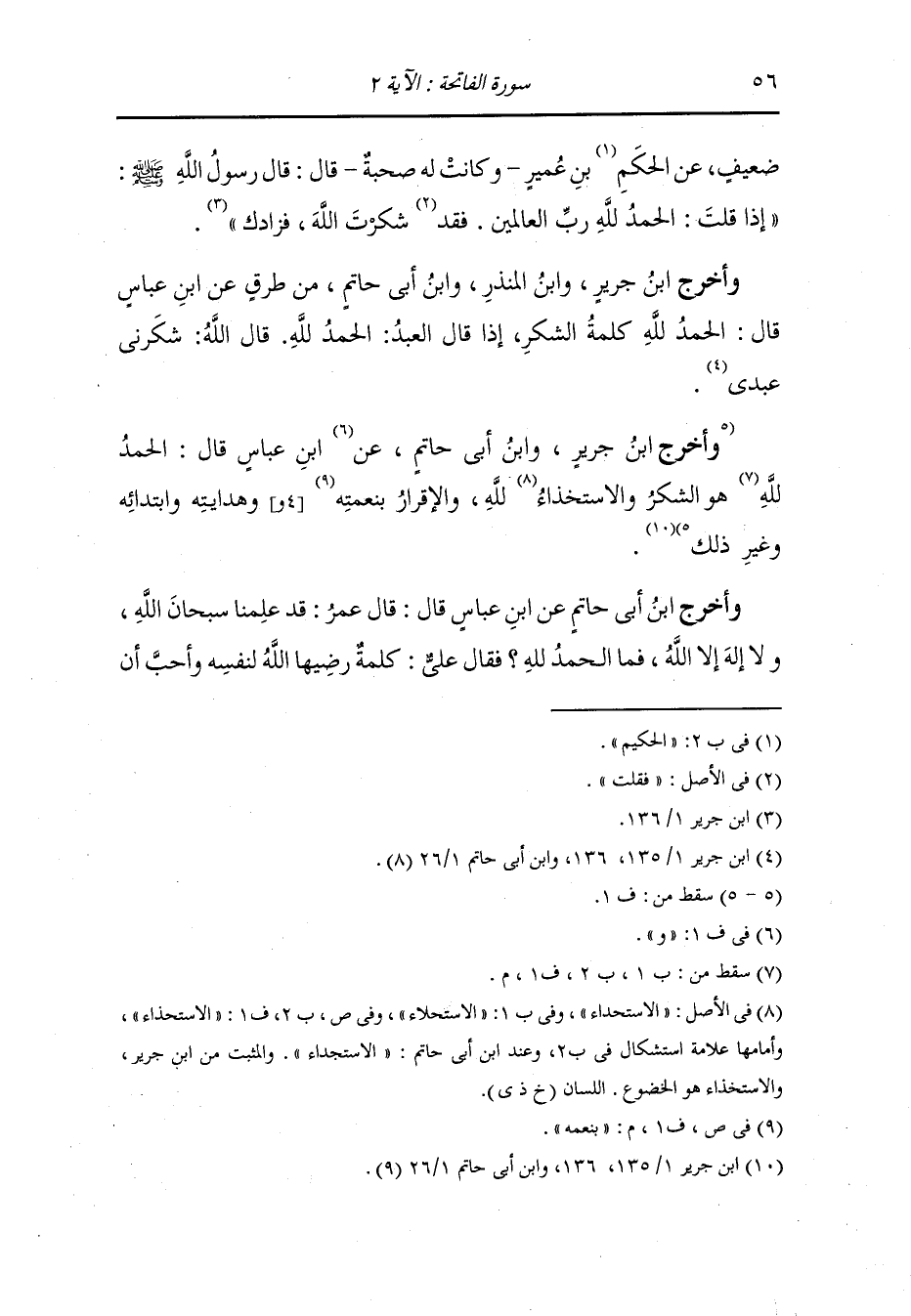 وأخرج ابن جرير ، وَابن المنذر ، وَابن أبي حاتم من طرق عن ابن عباس قال {الحمد لله} كلمة الشكر إذا قال العبد {الحمد لله} قال الله شكرني عبدي.