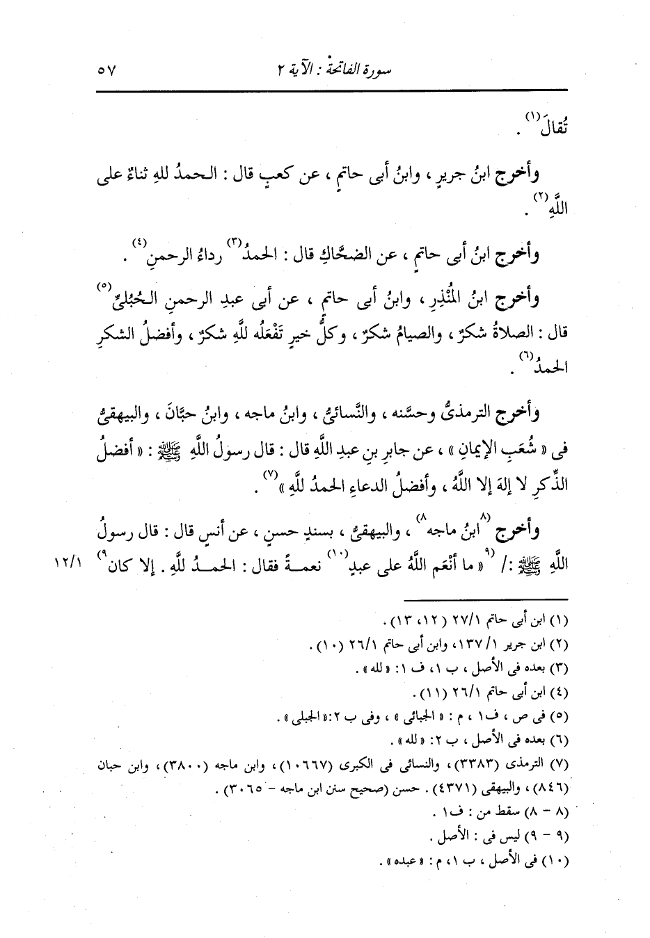 وأخرج الترمذي وحسنه والنسائي ، وَابن ماجه ، وَابن حبان والبيهقي في شعب الإيمان ، عَن جَابر بن عبد الله قال : قال رسول الله صلى الله عليه وسلم أفضل الذكر لا إله إلا الله وأفضل الدعاء {الحمد لله}.