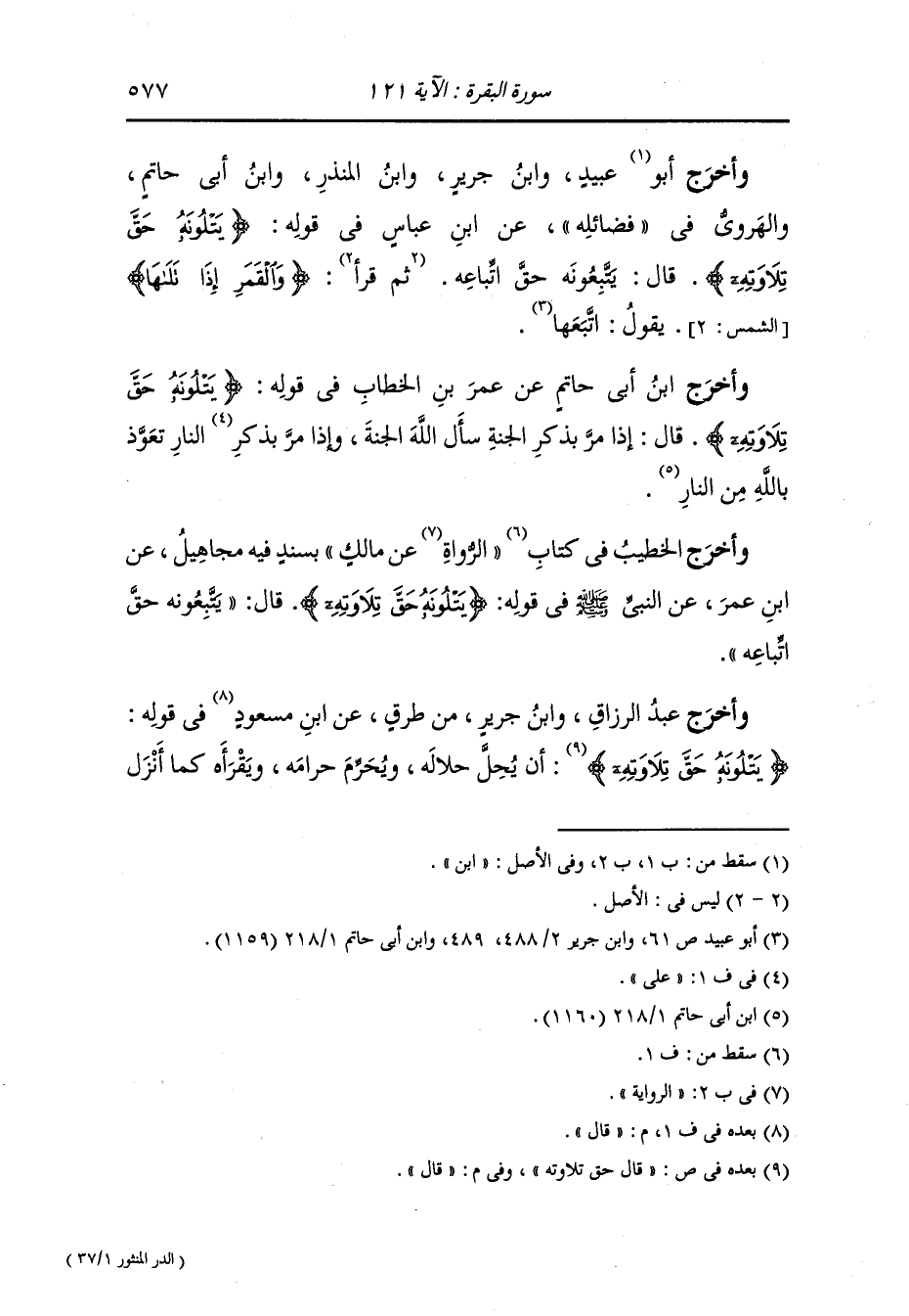 وأخرج ابن أبي حاتم عن زيد بن أسلم في قوله {يتلونه حق تلاوته} قال : يتكلمونه كما أنزل الله ولا يكتمونه.
