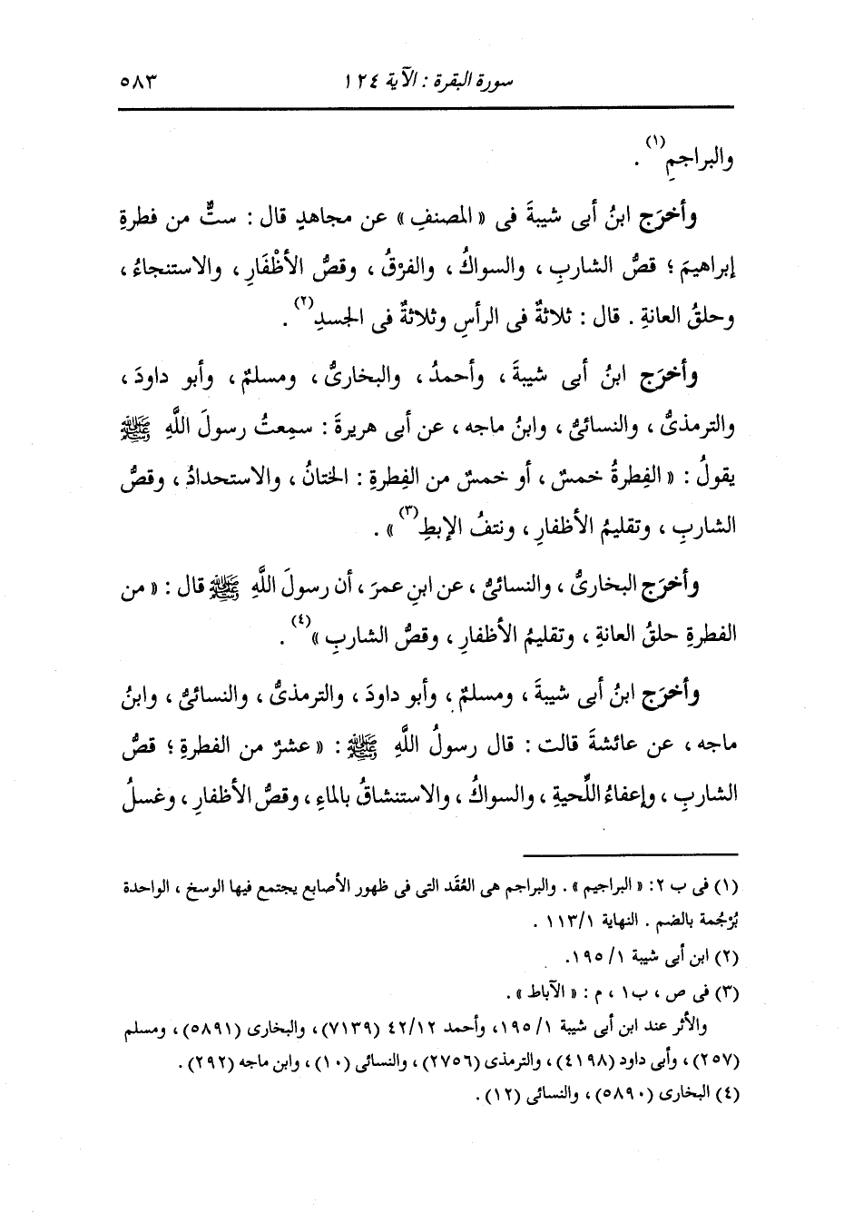 وأخرج ابن أبي شيبة وأحمد وأبو داود ، وَابن ماجه عن عمار بن ياسر أن رسول الله صلى الله عليه وسلم قال : الفطرة المضمضة والاستنشاق والسواك وقص الشارب وتقليم الأظفار ونتف الابط والاستنجاء وغسل البراجم والانتضاح والاختتان.