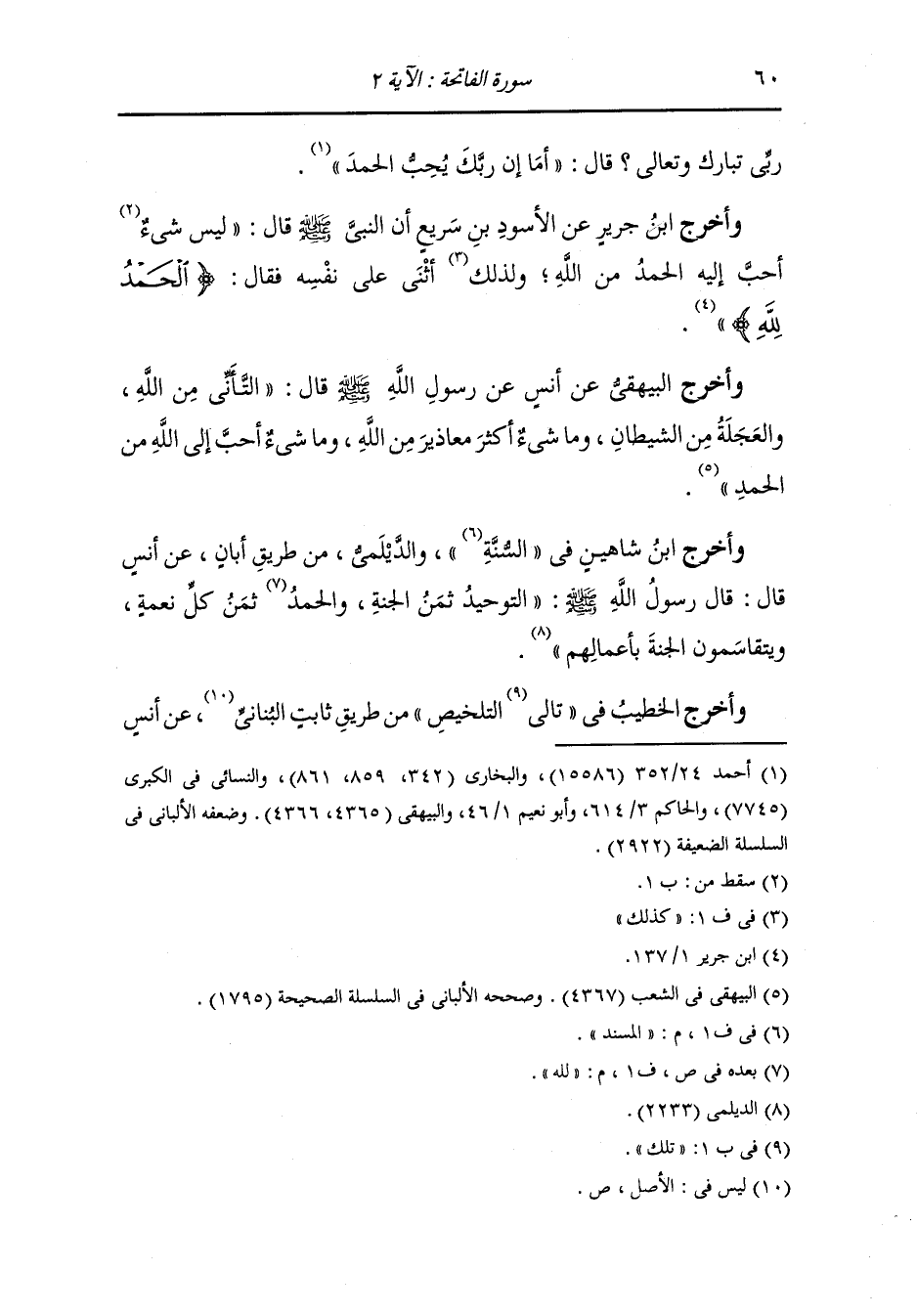 وأخرج ابن جرير عن الأسود بن سريع أن النَّبِيّ صلى الله عليه وسلم قال ليس شيء أحب إليه الحمد من الله ولذلك أثنى على نفسه فقال {الحمد لله}.