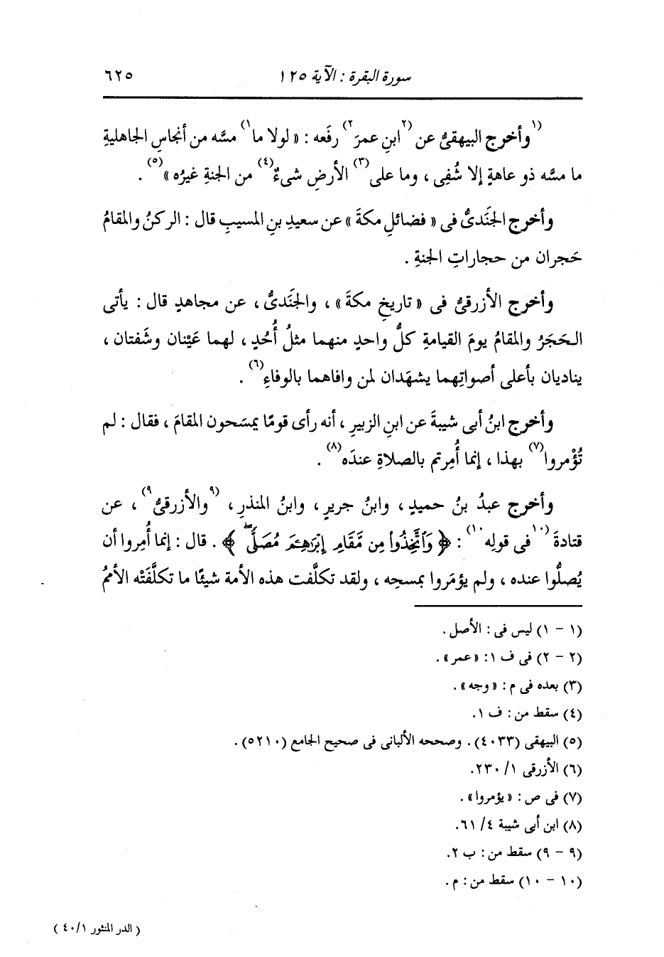 وأخرج الأزرقي عن ابي سعيد الخدري قال : سألت عبد الله بن سلام عن الأثر الذي في المقام فقال : كانت الحجارة على ما هي عليه اليوم إلا أن الله أراد أن يجعل المقام آية من آياته فلما أمر إبراهيم عليه السلام أن يؤذن في الناس بالحج قام على المقام وارتفع المقام حتى صار أطول الجبال وأشرف على ما تحته فقال : يا ايها الناس أجيبوا ربكم فأجابه الناس فقالوا : لبيك اللهم لبيك فكان أثره فيه لما أراد الله فكان ينظر عن يمينه وعن شماله أجيبوا ربكم فلما فرغ أمر بالمقام فوضعه قبله فكان يصلي إليه مستقبل الباب فهو قبلته إلى ما شاء الله ثم كان إسماعيل بعد يصلي إليه إلى باب الكعبة ثم كان رسول الله صلى الله عليه وسلم فأمر أن يصلي إلى بيت المقدس فصلى إليه قبل أن