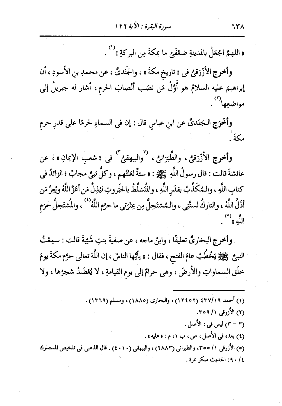 وأخرج ابن أبي شيبة والبخاري ومسلم وأبو داود والترمذي والنسائي والأزرقي عن ابن عباس قال : قال رسول الله صلى الله عليه وسلم يوم فتح مكة إنهذا البلد حرمه الله يوم خلق السموات والأرض والشمس والقمر ووضع هذين الأخشبين فهو حرام بحرمة
