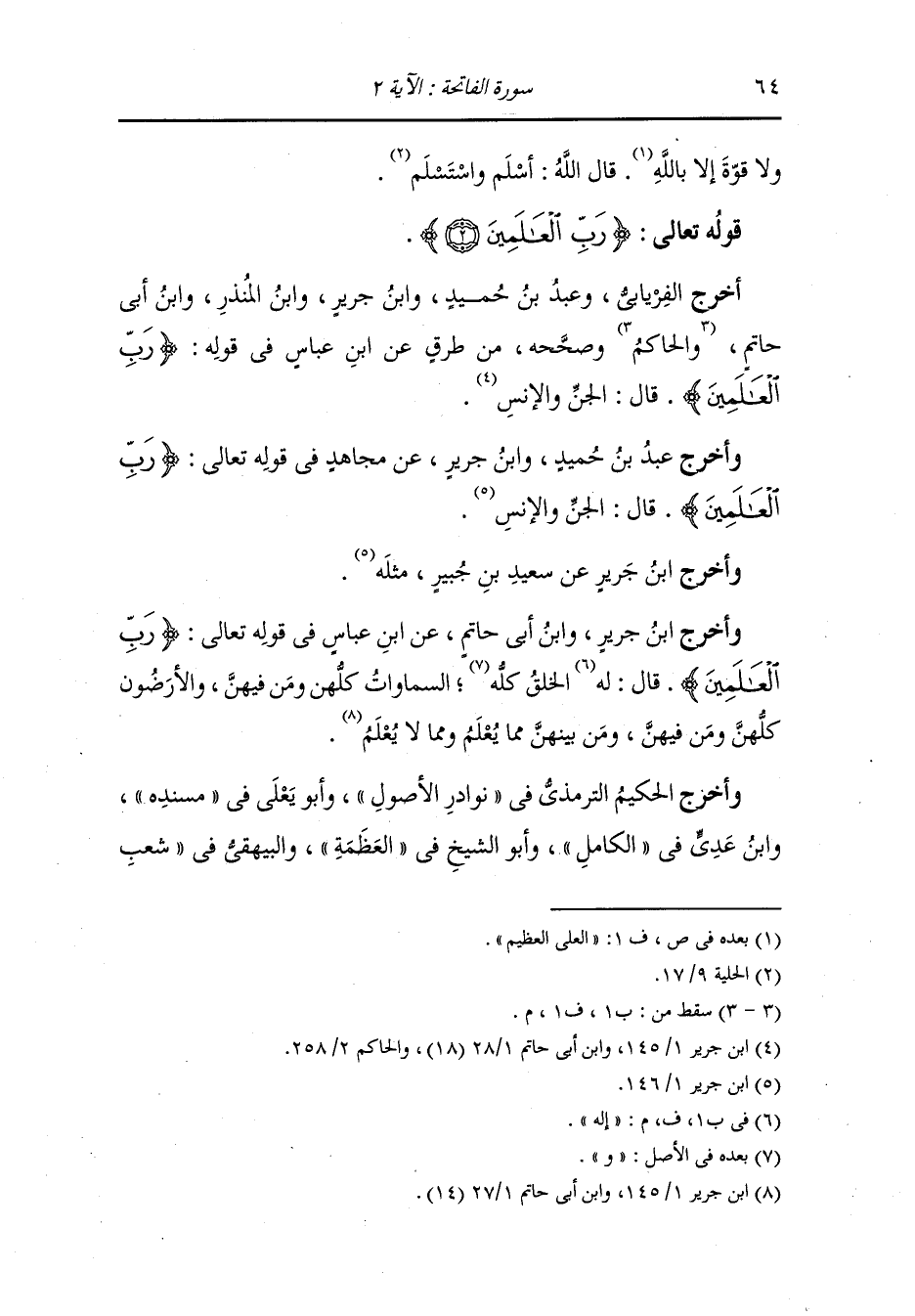 وأخرج ابن جرير ، وَابن أبي حاتم عن ابن عباس في قوله {رب العالمين} قال : إله الخلق كله ، السموات كلهن ومن فيهن والأرضون كلهن ومن فيهن ومن بينهن مما يعلم ومما لايعلم.
