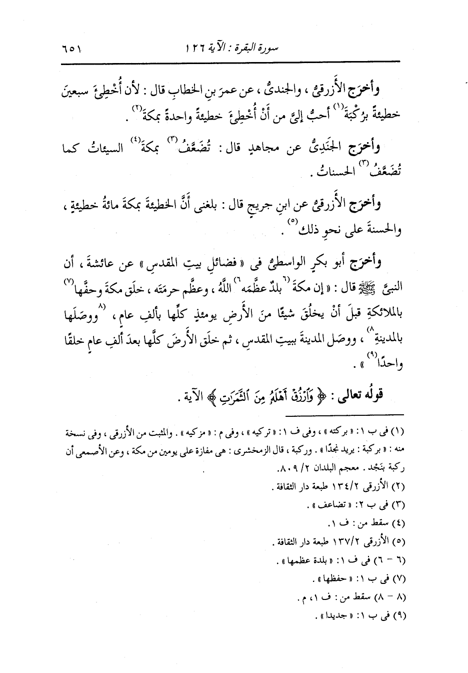 وأخرج الأزرقي عن محمد بن كعب القرظي قال : دعا إبراهيم للمؤمنين وترك الكفرا لم يدع لهم بشيء فقال {ومن كفر فأمتعه قليلا ثم أضطره إلى عذاب النار وبئس المصير}.