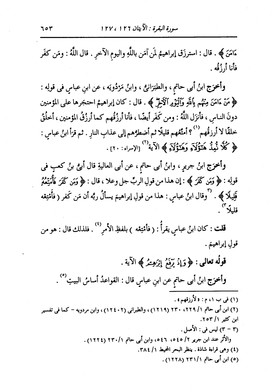 وأخرج أحمد ، وعَبد بن حُمَيد والبخاري ، وَابن جَرِير ، وَابن أبي حاتم والجندي ، وَابن مردويه والحاكم والبيهقي في الدلائل عن سعيد بن جبير أنه قال : سلوني يا معشر الشباب فإني قد أوشكت أن أذهب من بين أظهركم فأكثر الناس مسألته فقال له رجل : أصلحك الله أرأيت المقام أهو كما نتحدث قال : وماذا كنت تتحدث قال : كنا نقول أن غبراهيم حين جاء عرضت عليه امرأة اسماعيل النزول فأبى أن ينزل فجاءت بهذا الحجر فقال : ليس كذلك فقال سعيد بن جبير : قال ابن عباس : إن أول من اتخذ المناطق من النساء أم اسماعيل اتخذت منطقا لتعفي أثرها على سارة ثم جاء بها إبراهيم وبابنها اسماعيل وهي ترضعه حتى وضعهما عند البيت عند دوحة فوق زمزم في أعلى المسجد وليس بمكة يومئذ أحد وليس بها ماء فوضعهما هنالك ووضع عندهما جرابا فيه تمر وسقاء فيه ماء ثم قفى إبراهيم منطلقا فتبعته أم اسماعيل فقالت : يا إبراهيم أين تذهب وتتركنا بهذا الوادي الذي ليس فيه أنس ولا شيء قالت له ذلك مرارا وجعل لا يلتفت إليهما ، قالت له : آلله أمرك بهذا قال : نعم ، قالت : إذا لا يضيعنا ثم رجعت ، فانطلق إبراهيم حتى
