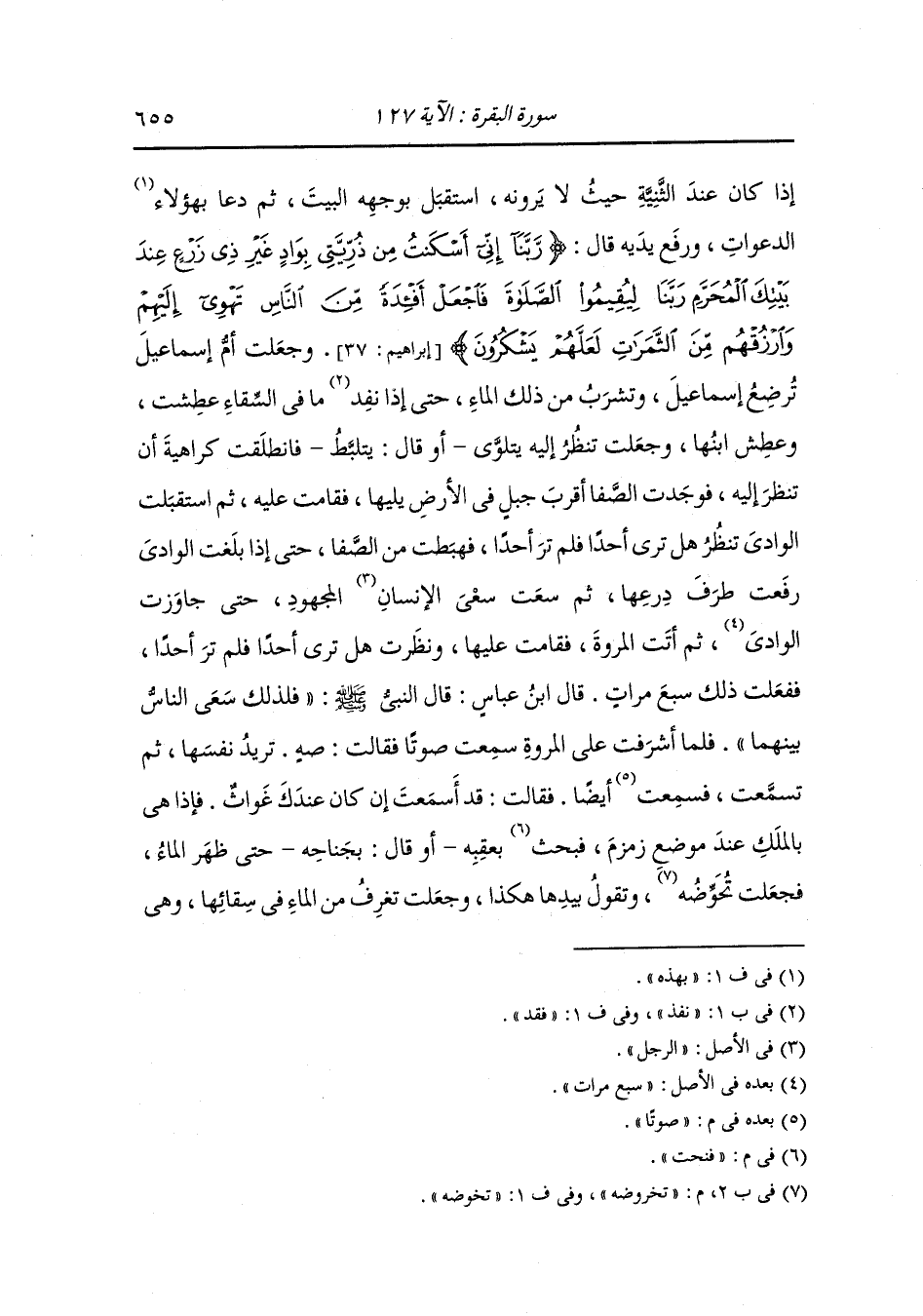تفور بعدما تغرف ، قال ابن عباس : قال النَّبِيّ صلى الله عليه وسلم يرحم الله أم اسماعيل لو تركت زمزم - أو قال - لو لم تغرف من الماء لكانت زمزم عينا معينا فشربت وأرضعت ولدها ، فقال لها الملك : لاتخافي الضيعة فإن ههنا بيتا لله عز وجل يبنيه هذا الغلام وأبوه وإن الله لا يضيع أهله وكان البيت مرتفعا من الأرض كالرابية تأتيه السيول فتأخذ عن يمينه وعن شماله فكانت كذلك حتى مرت بهم رفقة من جرهم أو أهل بيت من جرهم مقبلين من طريق كذا فنزلوا في أسفل مكة فرأوا طائرا عائفا فقالوا : إن هذا الطائر ليدور على الماء لعهدنا بهذا الوادي وما فيه ماء ، فأرسلوا جريا أو جريين فإذا هم بالماء فرجعوا فأخبروهم بالماء فأقبلوا قال : وأم اسماعيل عند الماء فقالوا به : أتأذنين لنا أن ننزل عندك قالت : نعم ولكن لا حق لكم في الماء قالوا : نعم ، قال ابن عباس قال النَّبِيّ صلى الله عليه وسلم فألفى ذلك أم اسماعيل وهي تحب الأنس ، فنزلوا وأرسلوا إلى أهليهم فنزلوا معه حتى إذا كان بها أهل أبيات منهم وشب الغلام وتعلم العربية منهم وأنفسهم وأعجبهم حين شب فلما أدرك زوجوه امرأة