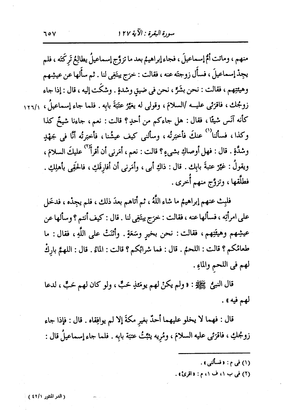 هل أتاكم من أحد قالت : نعم أتانا شيخ حسن الهيئة وأثنت عليه فسألني عنك فأخبرته وسألني كيف عيشنا فأخبرته إنا بخير ، قال : أما أوصاك بشيء قالت : نعم وهو يقرأ السلام ويأمرك أن تثبت عتبة بابك قال : ذاك ابي وأنت العتبة فأمرني أن أمسكك ، ثم لبث عنهم ما شاء الله ثم جاء بعد ذلك واسماعيل يبري نبلا تحت دوحة قريبا من زمزم فما رآه قام إليه فصنعا كما يصنع الولد بالوالد والوالد بالولد ثم قال : يا اسماعيل إن الله أمرني بأمر ، قال : فاصنع ما أمرك ، قال : وتعينني ، قال : وأعينك ، قال : فإن الله أمرني أن أبني ههنا بيتا وأشار إلى أكمة مرتفعة على ما حولها قال : فعند ذلك رفع القواعد من البيت فجعل اسماعيل يأتي بالحجارة وإبراهيم يبني حتى إذا ارتفع البناء جاء بهذا الحجر فوضعه له فقام عليه وهو يبني واسماعيل يناوله الحجارة وهما يقولان : ربنا تقبل منا إنك أنت السميع العليم ، قال معمر : وسمعت رجلا يقول : كان إبراهيم يأتيهم على البراق قال معمر : وسمعت رجلا يذكر أنهما حين التقيا بكيا حتى أجابتهما الطير.