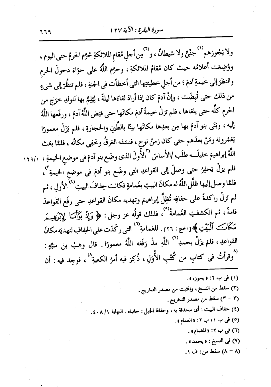 وأخرج البيهقي في الدلائل عن ابن عمرو قال : قال رسول الله صلى الله عليه وسلم بعث الله جبريل إلى آدم وحواء فقال لهما : ابنيا بيتا ، فخط لهما جبريل فجعل آدم يحفر وحواء تنقل حتى أجابه الماء نودي من تحته : حسبك يا آدم ، فلما بنياه أوحى الله إليه : أن يطوف به وقيل له : أنت أول الناس وهذا أول بيت ثم تناسخت القرون حتى حجة نوح ثم تناسخت القرون حتى رفع إبراهيم القواعد منه.