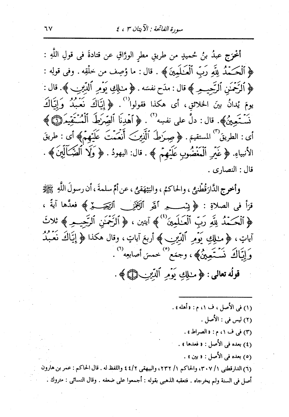 أخرج عَبد بن حُمَيد من طريق مطر الوراق عن قتادة في قول الله {الحمد لله رب العالمين} قال : ماوصف من خلقه ، وفي قوله {الرحمن الرحيم} قال : مدح نفسه {مالك يوم الدين} قال : يوم يدان بين الخلائق ، أي هكذا فقولوا {إياك نعبد وإياك نستعين} قال : دل على نفسه {اهدنا الصراط المستقيم} أي الصراط المستقيم {صراط الذين أنعمت عليهم} أي طريق الأنبياء {غير المغضوب عليهم} قال : اليهود {ولا الضالين} قال : النصارى.