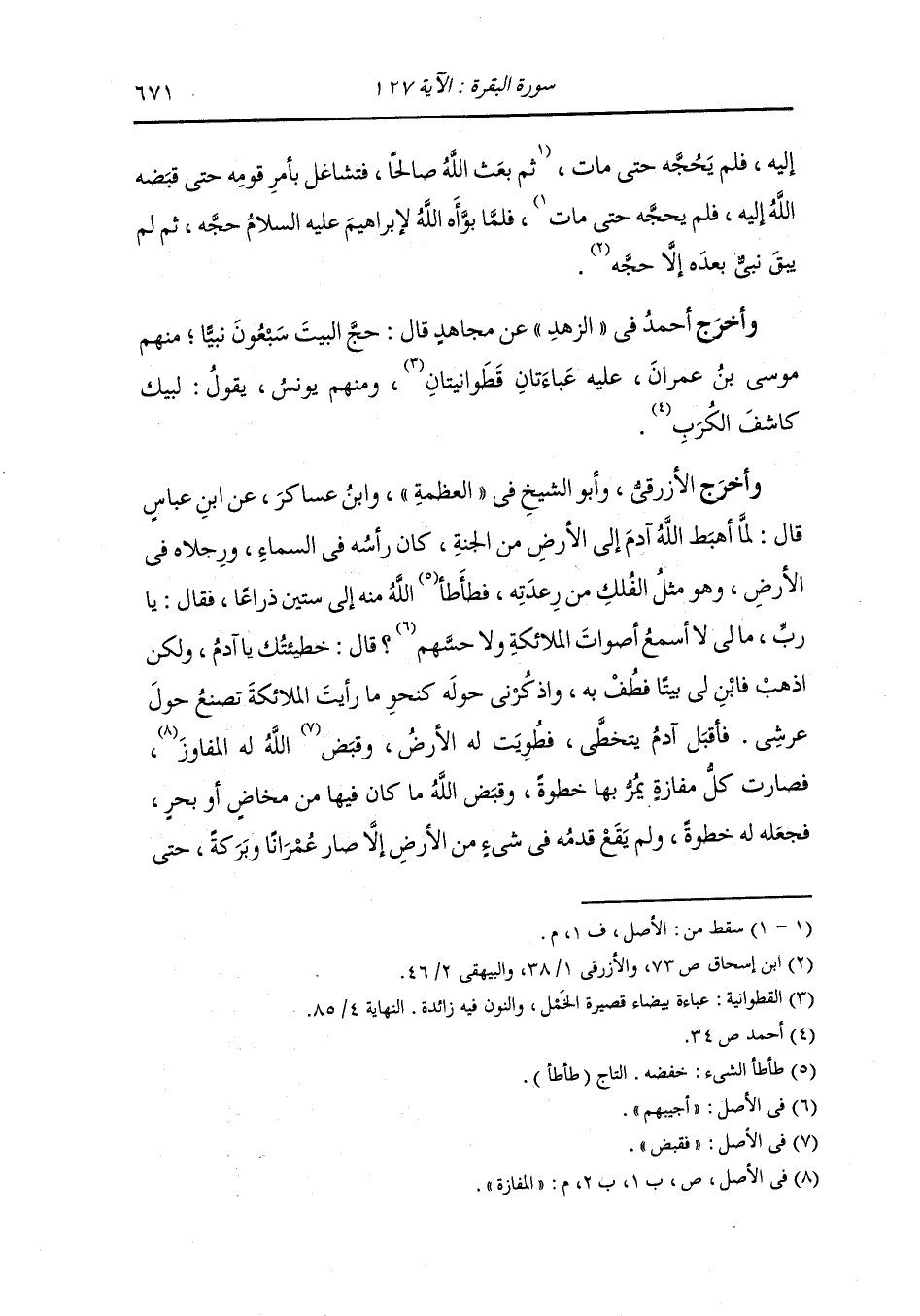 انتهى إلى مكة فبنى البيت الحرام وأن جبريل عليه السلام ضرب بجناحه الأرض فأبرز عن أس ثابت على الأرض السابعة فقذفت فيه الملائكة الصخر ما يطيق الصخرة منها ثلاثون رجلا وأنه بناه من خمسة أجبل ، من لبنان وطورزيتا وطورسينا والجودي وحراء حتى استوى على وجه الأرض فكان أول من أسس البيت وصلى فيه وطاف آدم عليه السلام حتى بعث الله الطوفان فكان غضبا ورجسا فحيثما انتهى الطوفان ذهب ريح آدم عليه السلام ولم يقرب الطوفان أرض السند والهند فدرس موضعه الطوفان حتى بعث الله إبراهيم واسماعيل عليهما السلام فرفعا قواعده وأعلامه ثم بنته قريش بعد ذلك وهو بحذاء البيت المعمور لو سقط ما سقط إلا عليه.
