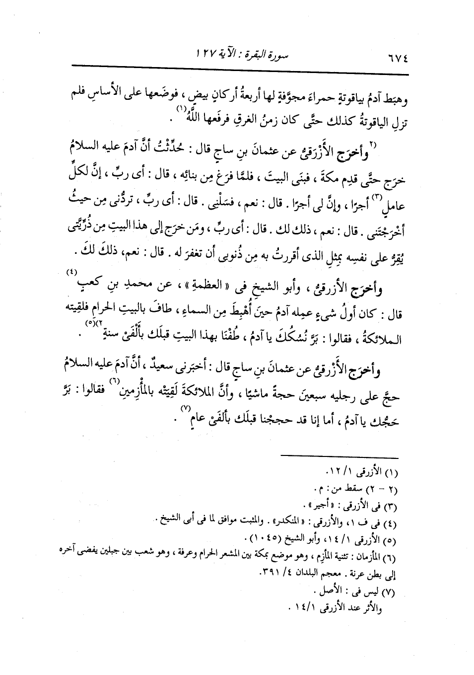 وأخرج الأزرقي عن مقاتل يرفع الحديث إلى النَّبِيّ صلى الله عليه وسلم ، أن آدم عليه السلام قال : أي رب إني أعرف شقوتي لا أرى شيئا من نورك بعد فأنزل الله عليه البيت الحرام على عرض البيت الذي في السماء وموضعه من ياقوت الجنة ولكن طوله ما بين السماء والأرض وأمره أن يطوف به فاذهب عنه الهم الذي كان قبل ذلك ثم رفع على عهد نوح عليه السلام.