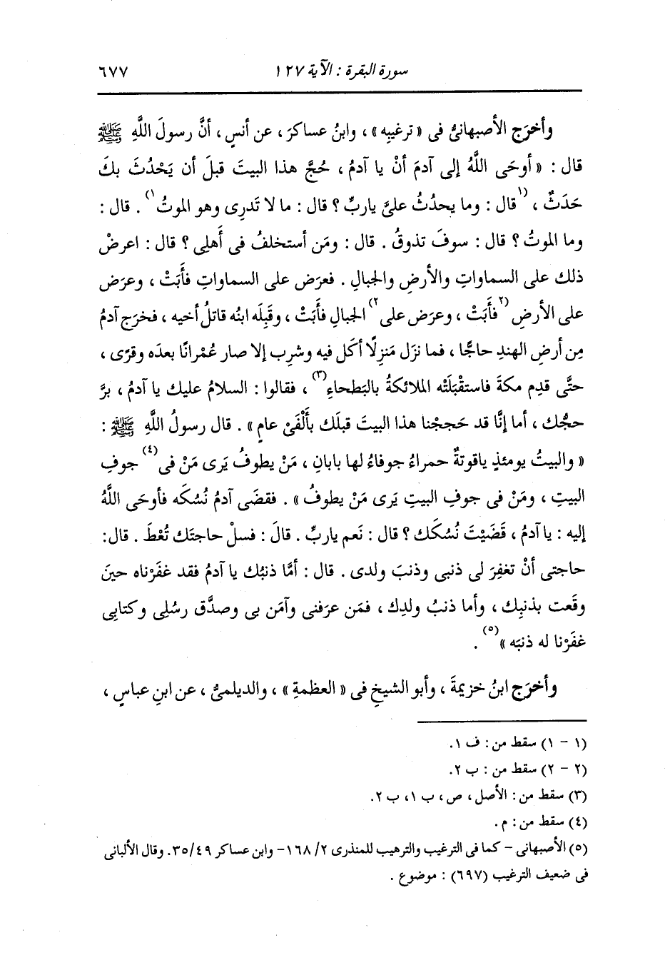 عن ابن عباس عن النَّبِيّ صلى الله عليه وسلم قال إن آدم أتى هذا البي ألف أتية لم يركب قط فيهن من الهند على رجليه من ذلك ثلثمائة حجة وسبعمائة عمرة وأول حجة حجها آدم وهو واقف بعرفات أتاه جبريل فقال : يا آدم بر نسكك أما إنا قد طفنا بهذا البيت قبل أن تخلق بخمسين ألف سنة.