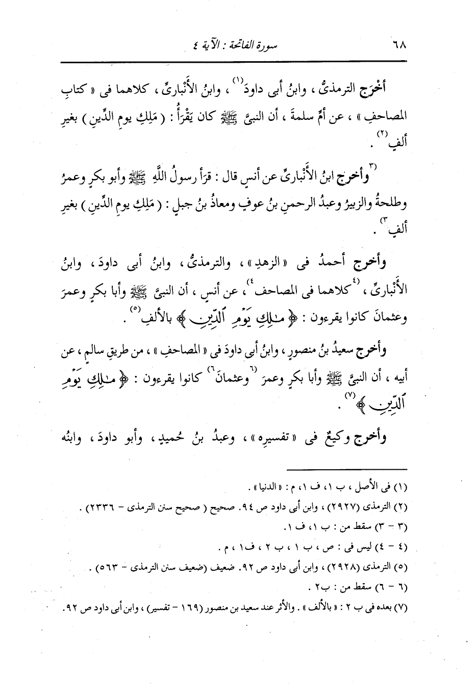 وأخرج أحمد في الزهد والترمذي ، وَابن أبي داود ، وَابن الأنباري عن أنس أن النَّبِيّ صلى الله عليه وسلم وأبا بكر وعمر وعثمان كانوا يقرؤون {مالك يوم الدين} بالألف.