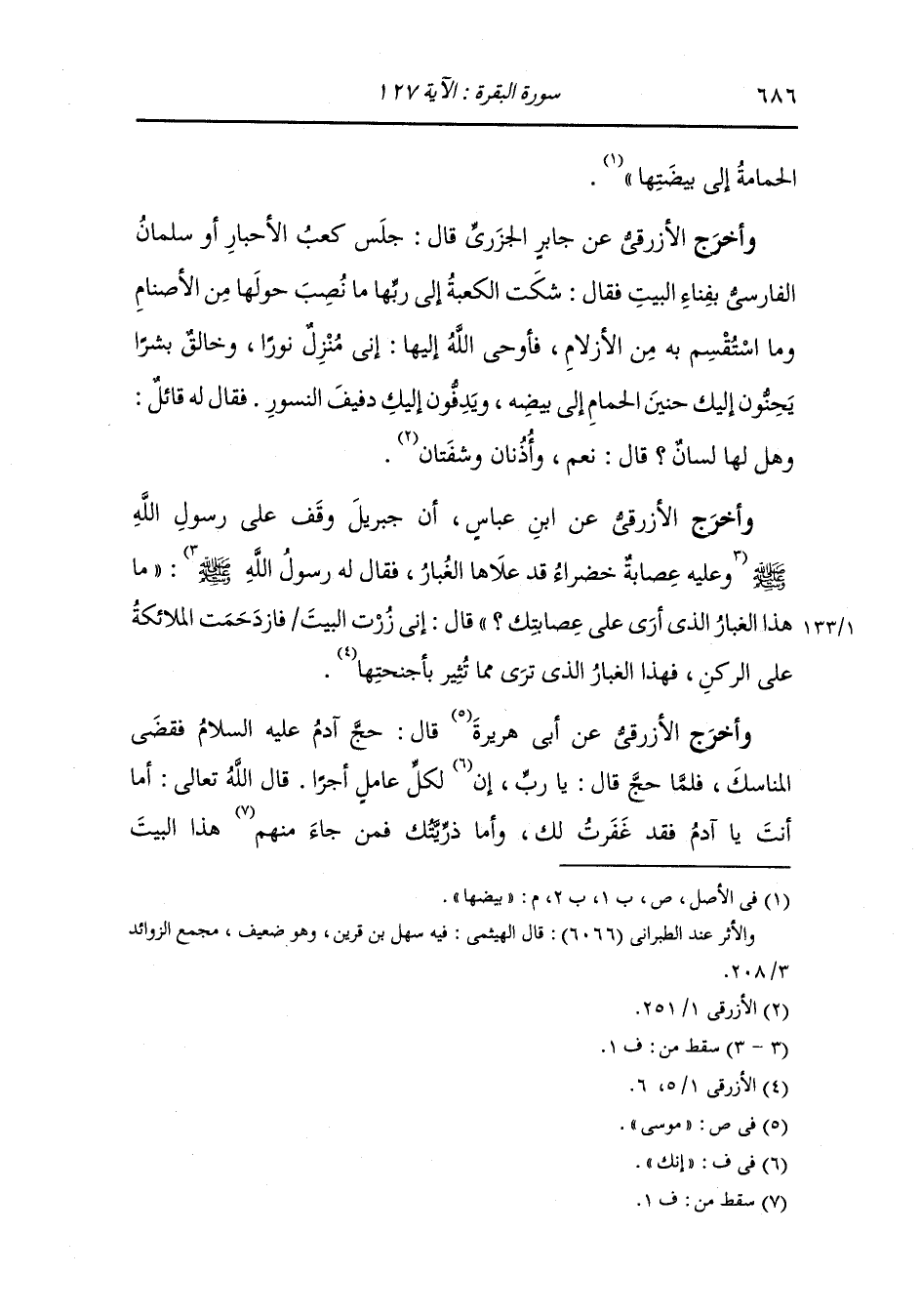 وأخرج الأزرقي والجندي ، وَابن عساكر عن ابن عباس قال : حج آدم فطاف بالبيت سبعا فلقيته الملائكة في الطواف فقالوا : بر حجك يا آدم أما إنا قد