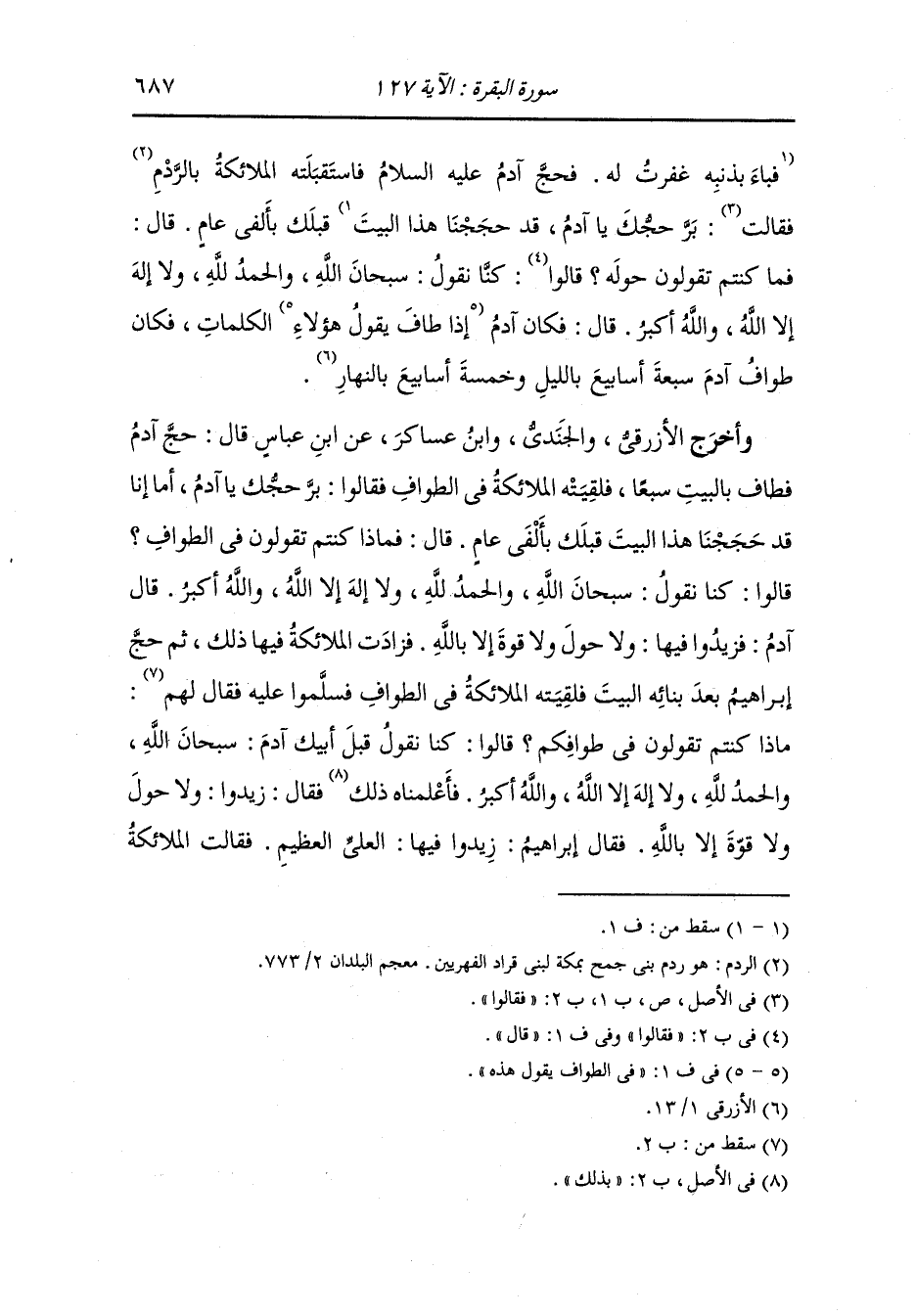 وأخرج الجندي والديلمي عن ابن عباس قال : قال رسول الله صلى الله عليه وسلم كان البيت قبل هبوط آدم ياقوتة من يواقيت الجنة وكان له بابان من زمرد أخضر باب شرقي وباب غربي وفيه قناديل من الجنة والبيت المعمور الذي في السماء يدخله كل يوم سبعون ألف ملك لا يعودون فيه إلى يوم القيامة حذاء الكعبة الحرام وأن الله عز وجل لما أهبط آدم إلى موضع الكعبة وهو مثل الفلك من شدة رعدته وأنزل عليه الحجر الأسود وهو يتلألأ كأنه لؤلؤة فأخذه آدم فضمه إليه استئناسا ثم أخذ الله من بني آدم ميثاقهم فجعله في الحجر الأسود ثم أنزل على آدم العصا ثم قال : يا آدم تخط ، فتخطى فإذا هو بأرض الهند فمكث هناك ما شاء الله ثم استوحش إلى البيت فقيل له : احجج يا آدم ، فأقبل يتخطى فصار كل موضع قدم قرية وما بين ذلك مفازة حتى قدم مكة فلقيته الملائكة فقالوا : بر حجك يا آدم لقد حججنا هذا البيت قبلك بألفي عام ، قال : فما كنتم تقولون حوله قالوا : كنا نقول : سبحان الله والحمد لله ولا إله إلا الله والله أكبر ، وكان آدم إذا طاف بالبيت قال هؤلاء الكلمات وكان آدم يطوف سبعة أسابيع بالنهار ، قال آدم : يا رب اجعل لهذا البيت عمارا يعمرونه من ذريتي فأوحى الله تعالى أني