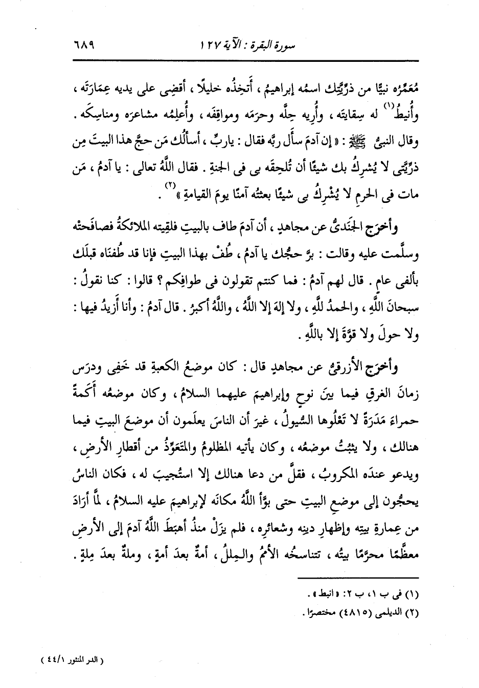 وأخرج الأزرقي عن مجاهد قال : أقبل إبراهيم عليه السلام والسكينه والصرد والملك من الشام فقالت السكينة : يا إبراهيم ربض على البيت فلذلك لا يطوف بالبيت ملك من جبابرة الملوك ولا أعرابي نافر إلا وعليه السكينة والوقار.