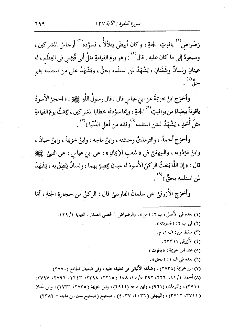 وأخرج الترمذي وحسنه والحاكم وصححه والبيهقي في شعب الإيمان عن ابن عباس قال : قال رسول الله صلى الله عليه وسلم إن لهذا الحجر لسانا وشفتين يشهد لمن استلمه يوم القيامة بحق.