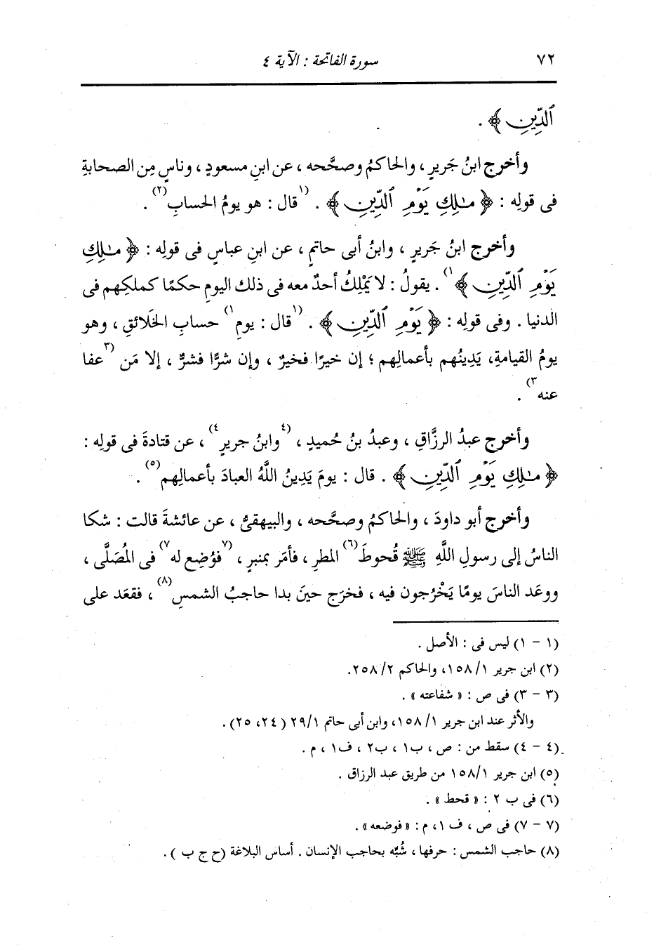 وأخرج ابن جرير والحاكم وصححه عن ابن مسعود وأناس من الصحابة في قوله {مالك يوم الدين} قال : هو يوم الحساب.