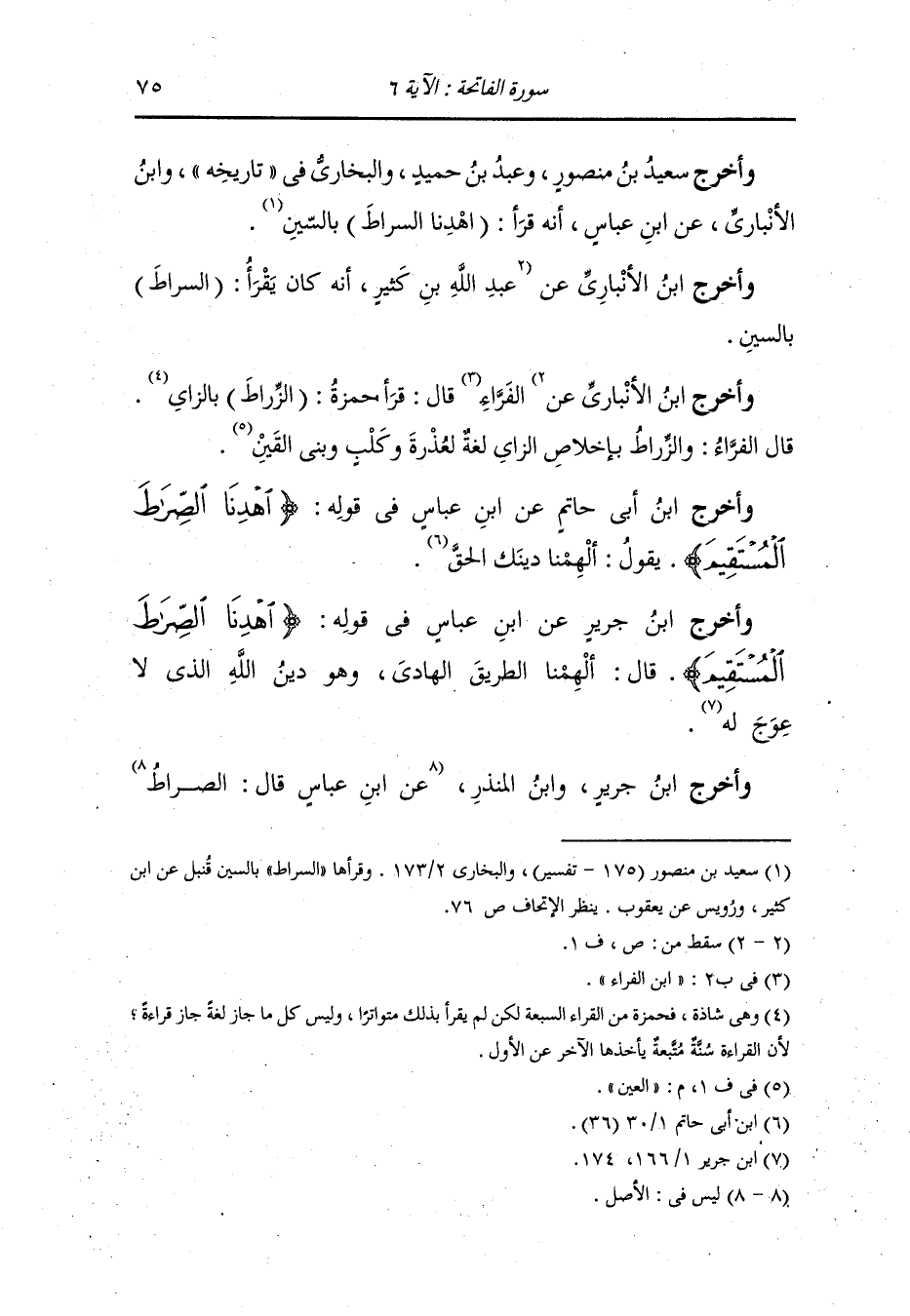 وأخرج ابن الأنباري عن عبد الله بن كثير ، أنه كان يقرأ / {السراط > / بالسين.