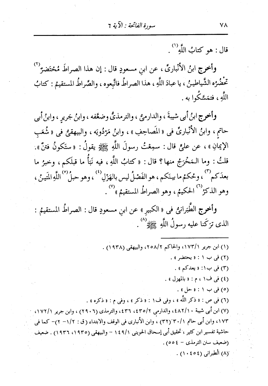 وأخرج ابن الأنباري عن ابن مسعود قال : إن هذا الصراط محتضر تحضره الشياطين ، ياعباد الله هذا الصراط فاتبعوه {الصراط المستقيم} كتاب الله فتمسكوا به.