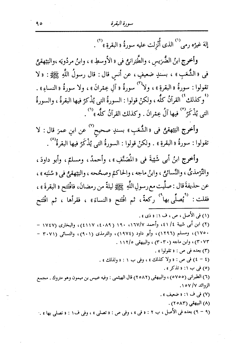 وأخرج البيهقي في الشعب بسند صحيح عن ابن عمر قال : لاتقولوا سورة البقرة ولكن قولوا : السورة التي يذكر فيها البقرة.