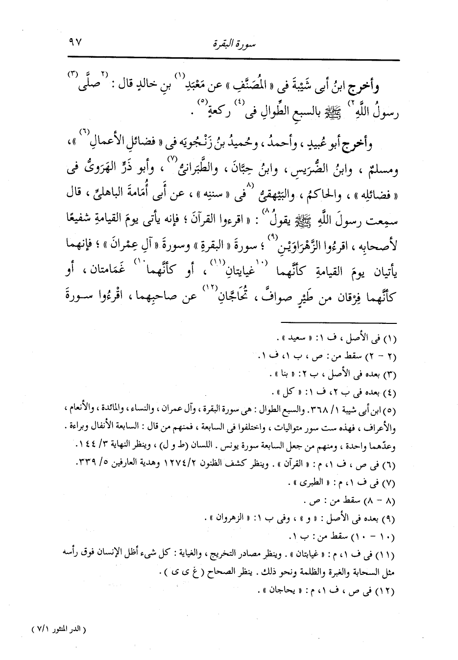 وأخرج أبو عبيد وأحمد وحميد بن زنجويه في فضائل القرآن ومسلم ، وَابن الضريس ، وَابن حبان والطبراني وأبو ذر الهروي في فضائله والحاكم والبيهقي في "سُنَنِه" عن أبي أمامة الباهلي قال سمعت رسول الله صلى الله عليه وسلم يقول : اقرؤا القرآن فإنه يأتي يوم القيامة شفيعا لأصحابه ، اقرؤا الزهراوين : سورة البقرة وسورة آل عمران فإنهما يأتيان يوم القيامة كأنهما غبابتان وكأنهما غمامتان أو كأنهما فرقان من طير صواف يحاجان عن صاحبهما ، اقرؤوا سورة