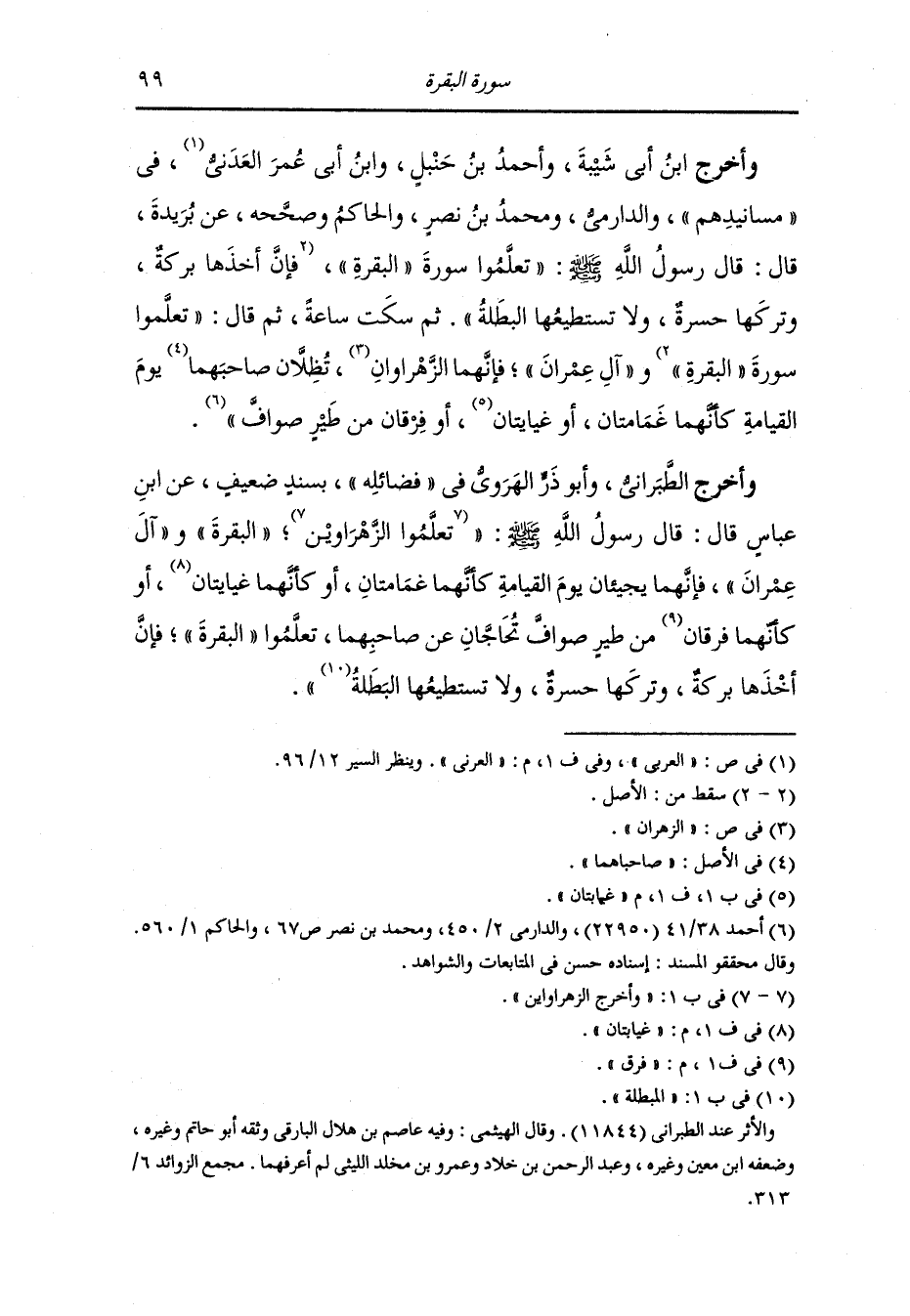 وأخرج ابن أبي شيبة وأحمد بن حنبل ، وَابن أبي عمر العربي في مسانيدهم والدارمي ومحمد بن نصر والحاكم وصححه عن بريدة قال : قال رسول الله صلى الله عليه وسلم تعلموا سورة البقرة فإن أخذها بركة وتركها حسرة ولا تستطعيها البطلة - ثم سكت ساعة - ثم قال : تعلموا سورة البقرة وآل عمران فإنهما الزهروان يظلان صاحبهما يوم القيامة كأنهما غمامتان أو غبابتان أو فرقان من طير صواف.
