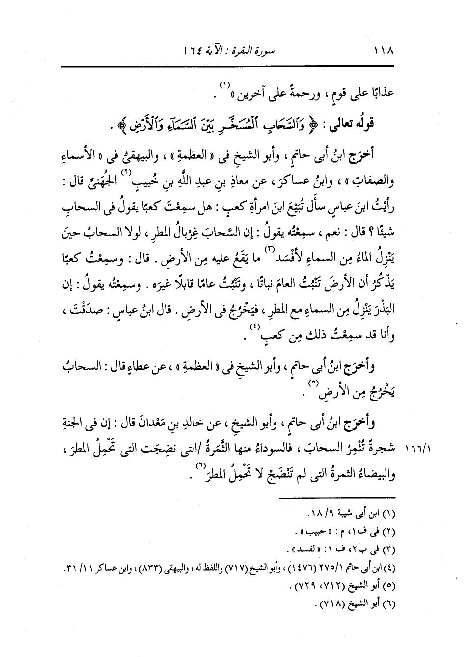 عباس : والله إن تفسير ذلك في كتاب الله (أرسلنا عليهم ريحا صرصرا) (القمر الآية 19) ، (أرسلنا عليهم الريح العقيم) (النازعات الآية 41) وقال (وأرسلنا الرياح لواقح) (الحجر الآية 22) ، (أن يرسل الرياح مبشرات) (الروم الآية 46).