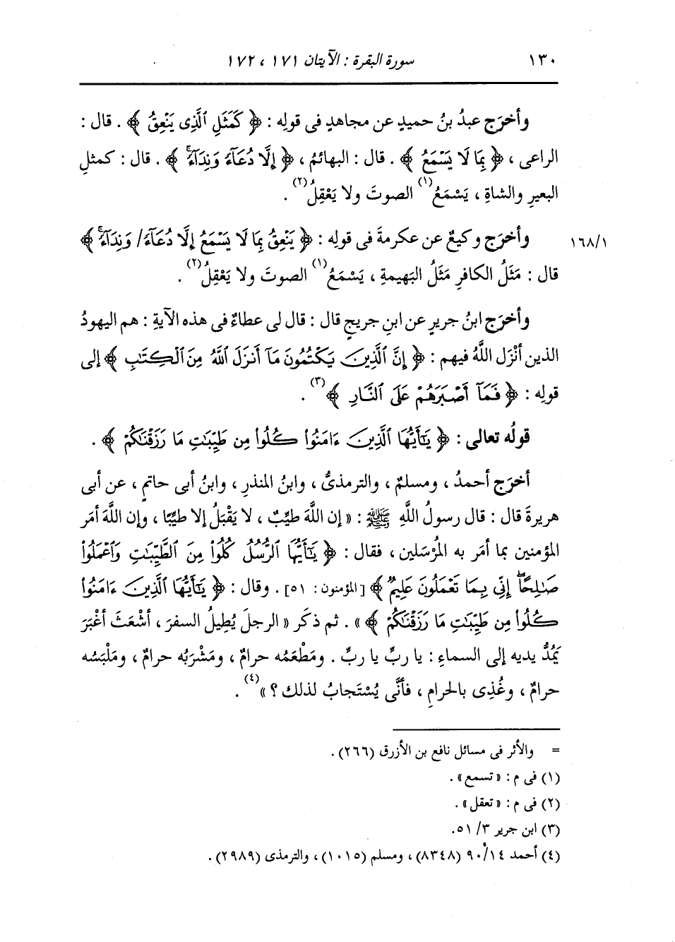 أخرج ابن جرير ، وَابن أبي حاتم عن ابن عباس في قوله {ومثل الذين كفروا كمثل الذي ينعق بما لا يسمع} قال : كمثل البقر والحمار والشاة وإن قلت لبعضهم كلاما لم يعلم ما تقول غير أنه يسمعك وكذلك الكافر إن أمرته بخير أو نهيته عن شر أو وعظته لم يعقل ما تقول غير أنه يسمع صوتك.