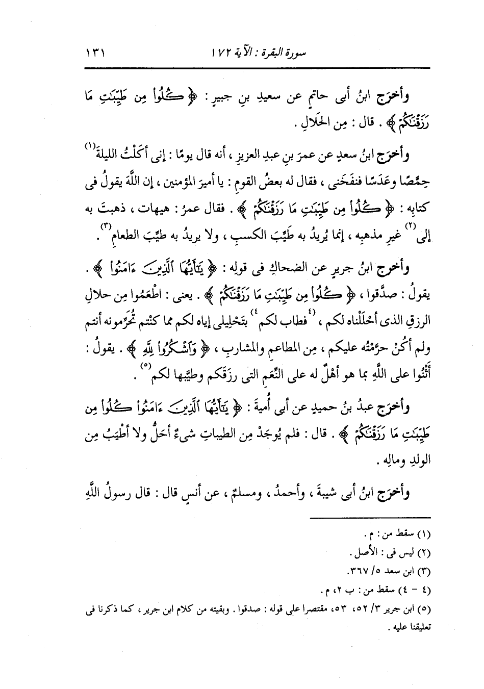 أخرج أحمد ومسلم والترمذي ، وَابن المنذر ، وَابن أبي حاتم عن أبي هريرة قال : قال رسول الله صلى الله عليه وسلم إن الله طيب لا يقبل إلا طيبا وإن الله أمر المؤمنين بما أمر به المرسلين فقال (يا أيها الرسل كلوا من الطيبات واعملوا صالحا إني بما تعملون عليم) (المؤمنون الآية 51) وقال {يا أيها الذين آمنوا كلوا من طيبات ما رزقناكم} ثم ذكر الرجل يطيل السفر أشعث أغبر يمد يديه إلى السماء يا رب يا رب ومطعمه حرام ومشربه حرام وملبسه حرام وغذي بالحرام فأنى يستجاب لذلك