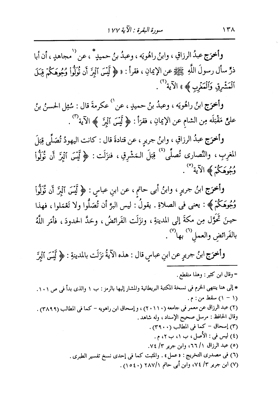 وأخرج إسحاق بن راهويه في مسنده ، وعَبد بن حُمَيد ، وَابن مردويه عن القاسم بن عبد الرحمن قال جاء رجل إلى أبي ذر فقال : ما الإيمان فتلا عليه هذه اللآية {ليس البر أن تولوا وجوهكم} حتى فرغ منها ، فقال الرجل : ليس عن البرسألتك ، فقال أبو ذر : جاء رجل إلى رسول الله صلى الله عليه وسلم فسأله عما سألتني فقرأ عليه هذه الآية فأبى أن يرضى كما أبيت أن ترضى فقال له رسول الله صلى الله عليه وسلم : ادن ، فدنا فقال : المؤمن إذا عمل الحسنة سرته رجاء ثوابها وإذا عمل السيئة أحزنته وخاف عقابه