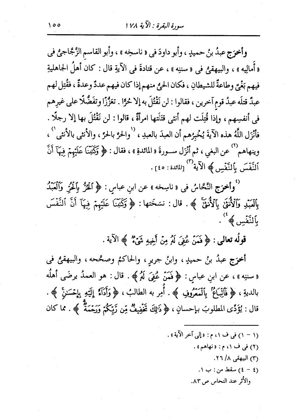 وأخرج ابن جرير ، وَابن مردويه عن أبي مالك قال : كان بين حيين من الأنصار قتال كان لأحدهما على الآخر الطول فكأنهم طلبوا الفضل فجاء النَّبِيّ صلى الله عليه وسلم ليصلح بينهم فنزلت الآية {الحر بالحر والعبد بالعبد والأنثى بالأنثى} قال ابن عباس : نسختها (النفس بالنفس) (المائدة الآية 45).