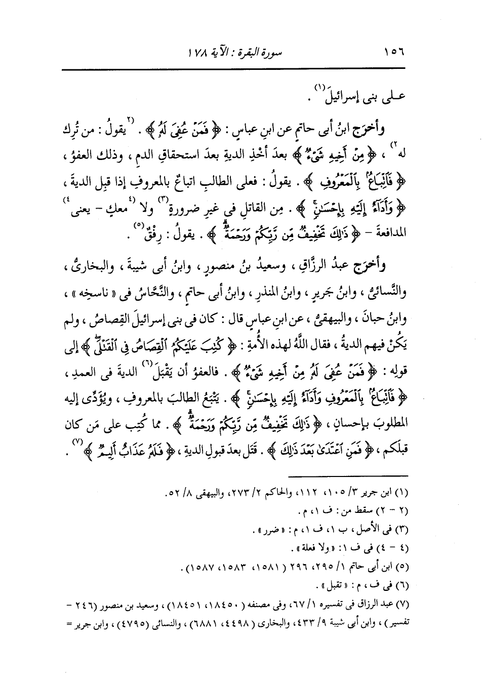 وأخرج النحاس في ناسخه عن ابن عباس {الحر بالحر والعبد بالعبد والأنثى بالأنثى} ، قال : نسختها (وكتبنا عليهم فيها أن النفس بالنفس) (المائدة الآية 45) الآية ، أما قوله تعالى : {فمن عفي له} الآية.