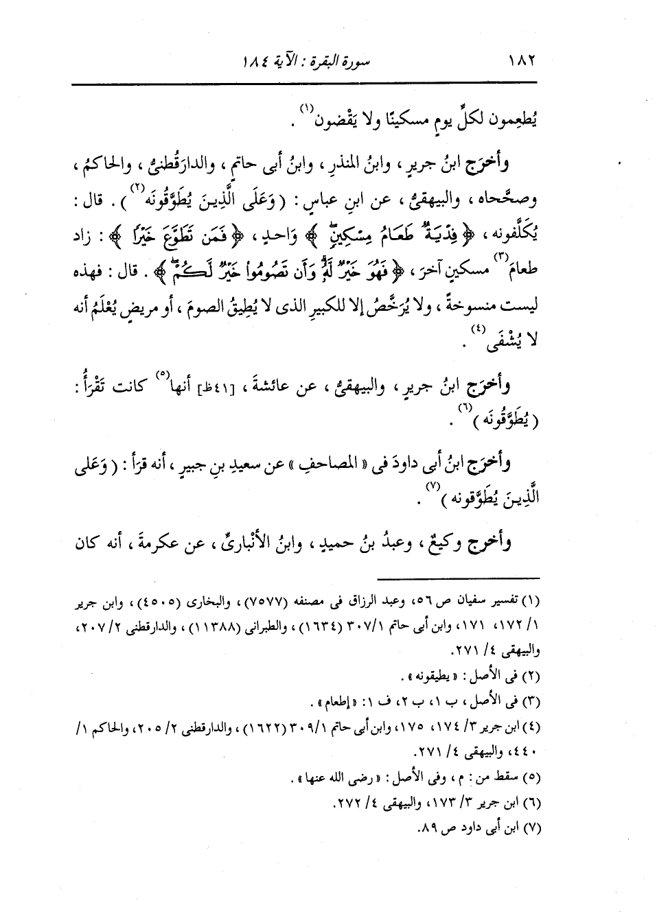 وأخرج وكيع وسفيان وعبد الرزاق والفريابي والبخاري وأبو داود في ناسخه ، وَابن جَرِير ، وَابن المنذر ، وَابن أبي حاتم ، وَابن الأنباري في المصاحف والطبراني والدارقطني والبيهقي من طرق عن ابن عباس أنه كان يقرأ ((وعلى الذين يطوقونه)) مشددة قال : يكلفونه ولا يطيقونه ويقول : ليست بمنسوخة هو الشيخ الكبير الهرم والعجوز الكبيرة الهرمة