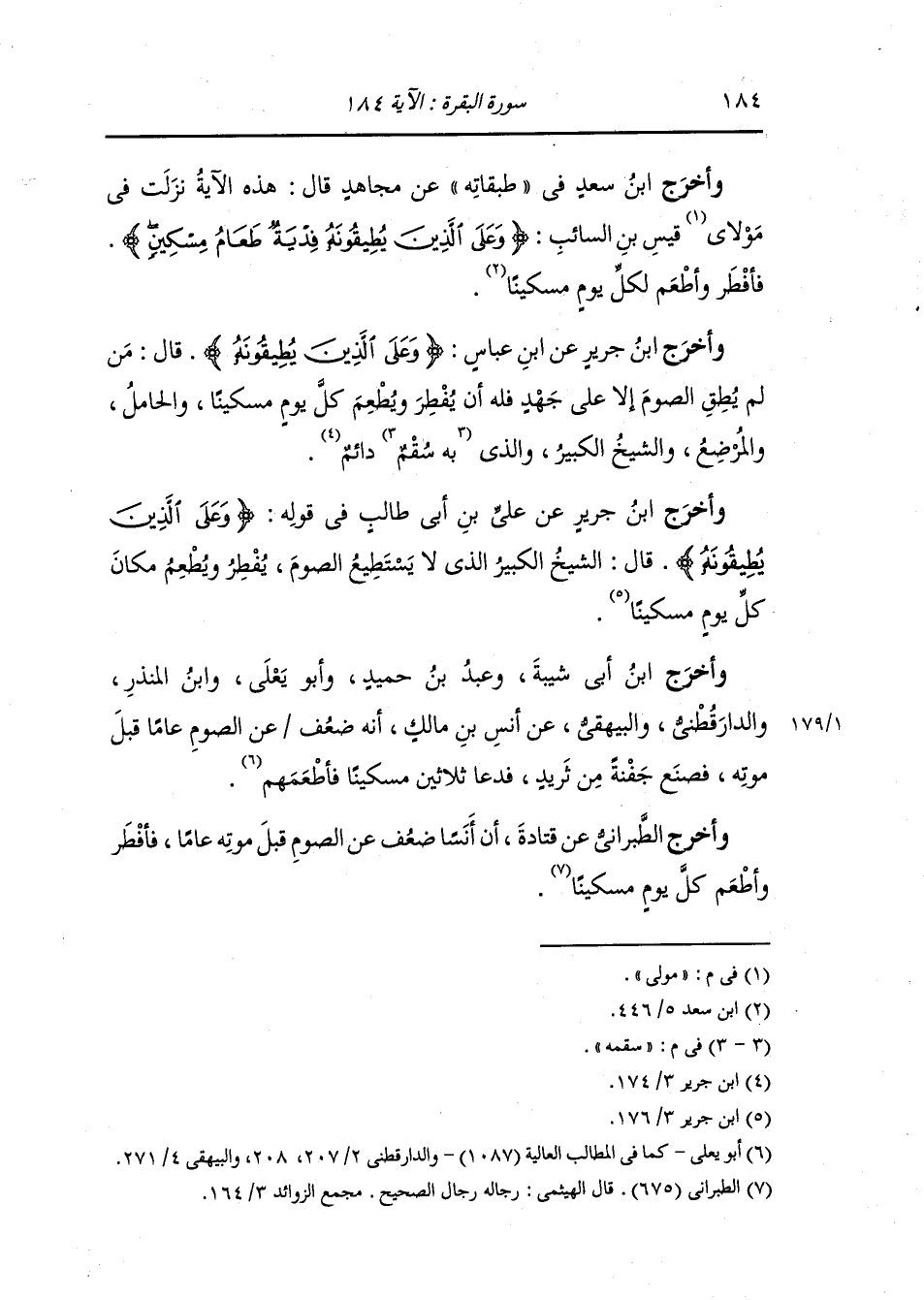 وأخرج عَبد بن حُمَيد وأبو داود في ناسخه ، وَابن جَرِير ، وَابن أبي حاتم والدارقطني والبيهقي عن ابن عباس {وعلى الذين يطيقونه} قال : ليست بمنسوخة هو الشيخ الكبير الذي لا يطيق الصيام يفطر ويتصدق لكل يوم نصف صاع من بر مدا لطعامه ومدا لإدامه