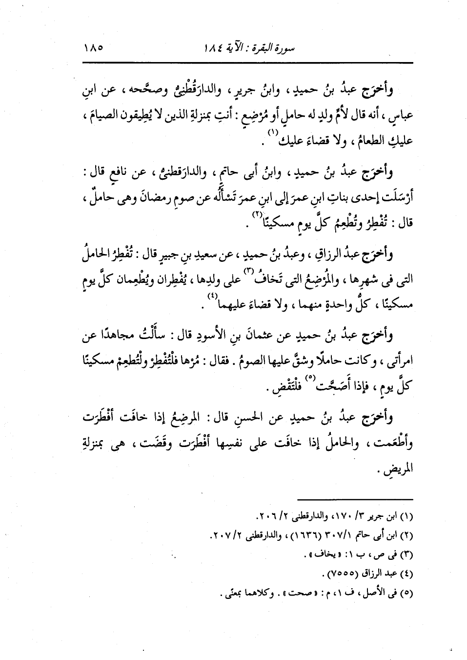 وأخرج ابن جرير عن ابن عباس {وعلى الذين يطيقونه} قال : من لم يطق الصوم إلا على جهد فله أن يفطر ويطعم كل يوم مسكينا والحامل والمرضع والشيخ الكبير والذي سقمه دائم.