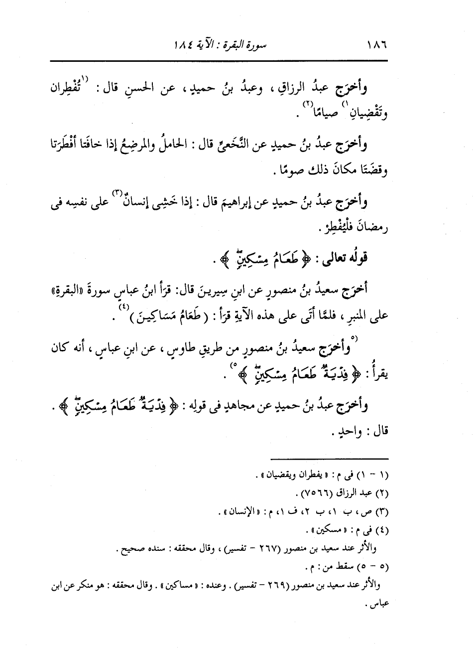 وأخرج عبد الرزاق ، وعَبد بن حُمَيد عن سعيد بن جبير قال : تفطر الحامل التي في شهرها والمرضع التي تخاف على ولدها يفطران ويطعمان كل يوم مسكينا كل واحد منهما ولا قضاء عليهما.