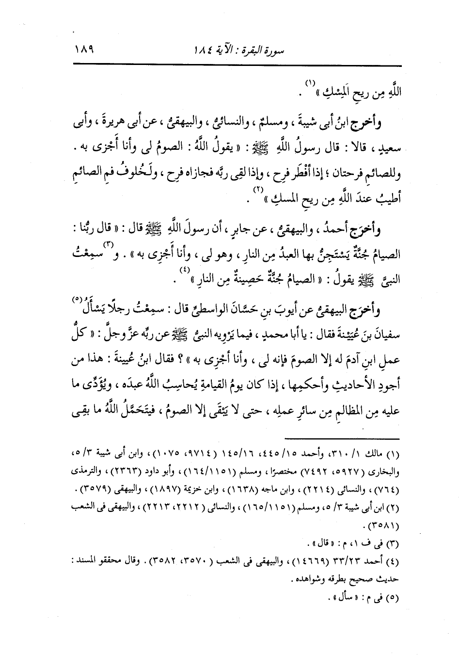 وأخرج مالك وأحمد ، وَابن أبي شيبة والبخاري ومسلم وأبو داود والترمذي والنسائي ، وَابن ماجه ، وَابن خزيمة والبيهقي في شعب الإيمان عن أبي هريرة قال : قال رسول الله صلى الله عليه وسلم كل عمل ابن آدم يضاعف الحسنة عشرة أمثالها إلى سبعمائة ضعف قال الله عز وجل : إلا الصوم فإنه لي وأنا أجزي به يدع طعامه وشرابه وشهوته من أجلي للصائم فرحتان : فرحة عند فطره فرحة عند لقاء ربه ولخلوف فم الصائم أطيب عند