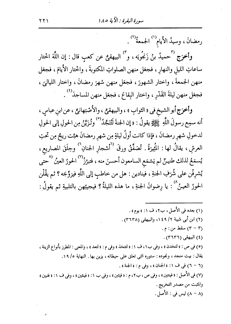 وأخرج البيهقي والأصبهاني عن أبي سعيد الخدري قال : قال رسول الله صلى الله عليه وسلم إذا كان أول ليلة من رمضان فتحت أبواب السماء فلا يغلق منها باب حتى يكون آخر ليلة من رمضان وليس من عبد مؤمن يصلي في ليلة منها إلا كتب الله ألفا وخمسمائة حسنة بكل سجدة وبنى له بيتا في الجنة من ياقوتة حمراء لها ستون ألف باب فيها قصر من ذهب موشح بياقوتة حمراء فإذا صام أول يوم من رمضان غفر له ما تقدم من ذنبه إلى مثل ذلك اليوم من شهر رمضان واستغفر له كل يوم سبعون ألف ملك من صلاة الغداة إلى أن توارى بالحجاب وكان له بكل سجدة يسجدها في شهر رمضان بليل أو نهار شجرة يسير الراكب في ظلها خمسمائة عام.