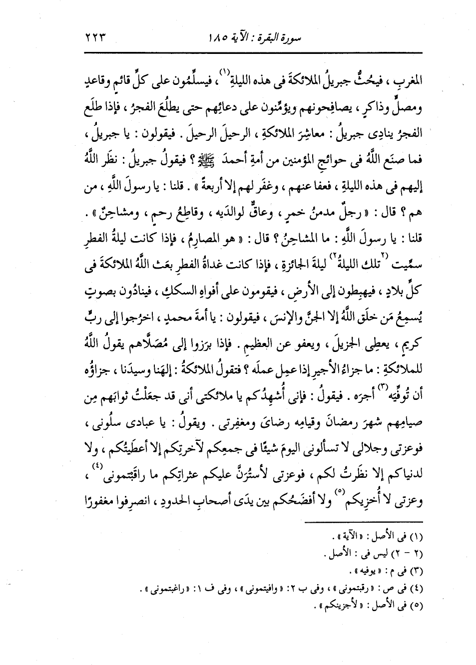 هذه أول ليلة من شهر رمضان فتحت أبواب الجنة على الصائمين من أمة محمد ويا جبريل إهبط إلى الأرض فاصفد مردة الشياطين وغلهم بالأغلال ثم اقذفهم في البحار حتى لا يفسدوا على أمة محمد حبيبي صيامهم ويقول الله عز وجل في ليلة من شهر رمضان لمناد ينادي ثلاث مرات : هل من سائل فأعطيه سؤله هل من تائب فأتوب عليه هل من مستغفر فأغفر له من يقرض المليء غير المعدم والوفي غير الظلوم قال : وله في كل يوم من شهر رمضان عند الإفطار ألف ألف عتيق من النار كلهم قد استوجبوا النار فإذا كان آخر يوم من شهر رمضان أعتق الله في ذلك اليوم بقدر ما أعتق من أول الشهر إلى آخره ، وإذا كان ليلة القدر يأمر الله جبريل فيهبط في كبكبة من الملائكة إلى الأرض ومعهم لواء أخضر فيركز اللواء على ظهر الكعبة وله ستمائة جناح منها جناحان لا ينشرهما إلا في تلك الليلة فينشرهما في تلك الليلة فتجاوز المشرق إلى من