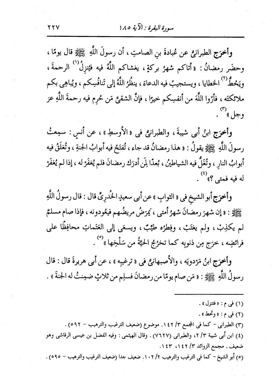 وأخرج الأصبهاني في الترغيب عن أبي هريرة قال : قال رسول الله صلى الله عليه وسلم إذا كان أول ليلة من شهر رمضان نظر الله إلى خلقه وإذا نظر الله إلى عبده لم يعذبه أبدا ولله في كل يوم ألف ألف عتيق من النار فإذا كانت ليلة تسع وعشرين أعتق الله فيها مثل جميع ما أعتق في الشهر كله فإذا كانت ليلة القدر ارتجت الملائكة وتجلى الجبار بنوره مع أنه لا يصفه الواصفون فيقول لملائكته وهم في عيدهم من الغد : يا معشر الملائكة ما جزاء الأجير إذا وفى عمله تقول الملائكة : يوفى أجره ، فيقول الله : أشهدكم أني قد غفرت لهم من