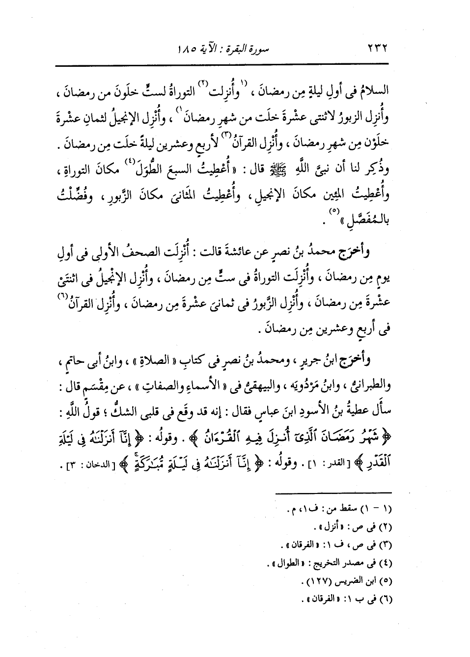 أخرج أحمد ، وَابن جَرِير ومحمد بن نصر ، وَابن أبي حاتم والطبراني والبيهقي في شعب الإيمان والأصبهاني في الترغيب عن وائلة بن الأسقع أن رسول الله صلى الله عليه وسلم قال : أنزلت صحف إبراهيم في أول ليلة من رمضان وأنزلت التوراة لست مضين من رمضان وأنزل الإنجيل لثلاث عشرة خلت من رمضان وأنزل الزبور لثمان عشرة من رمضان وأنزل الله القرآن لأربع وعشرين خلت من رمضان.