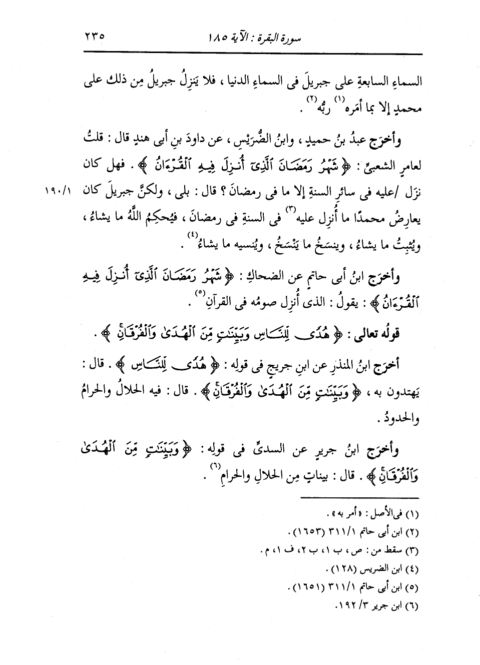 وأخرج ابن جرير عن ابن عباس قال : نزل القرآن جملة واحدة على جبريل في ليلة القدر فكان لا ينزل منه إلا ما أمر به.